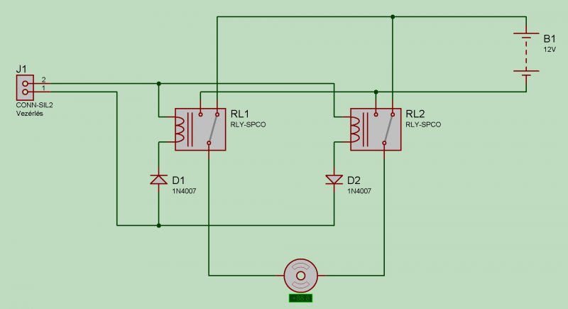 Mindig csak egy relé húz meg. Nincs szükség kereszt reteszre, mert ha netán egyszerre meghúzna mind a két relé akkor a motor csak fékezne. Mind a két polusára ugyan azt a feszültséget kapja. Szerintem ennél egyszerübb nem lehetne. Még valami. A szabályzód ugye meg tud hajtani egyszerre egy relét? (max 100mA) Remélem tudtam segíteni...