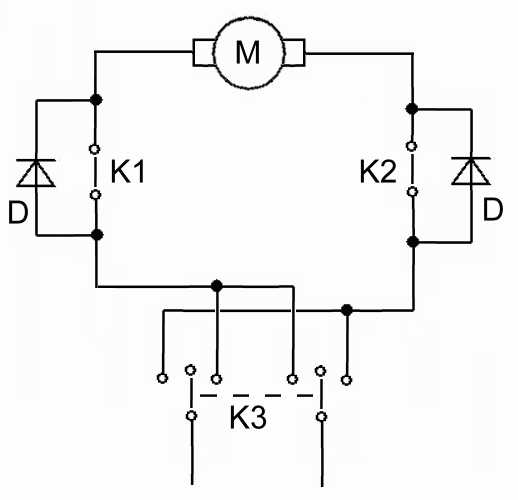 Tudom hogy már van pár hasonlo topik de sajnos sehol sem találtam kielégítő választ! Van egy egyenáramu motorom! Ezt szeretném relével vezérelni. Namost van két végállás kapcsoló meg egy három állású kapcsoló! egyik állásban elindulna a motor,majd a végállás kapcsoló megállítaná aztán kapcsolás másik állásba a motor elindul vissza felé és itt is megállítja egy végálláskapcsoló! Ehhez kellene nekem egy kapcsolási rajz! Ja 12 Vos rendszerről van szó! Előre is köszönöm!