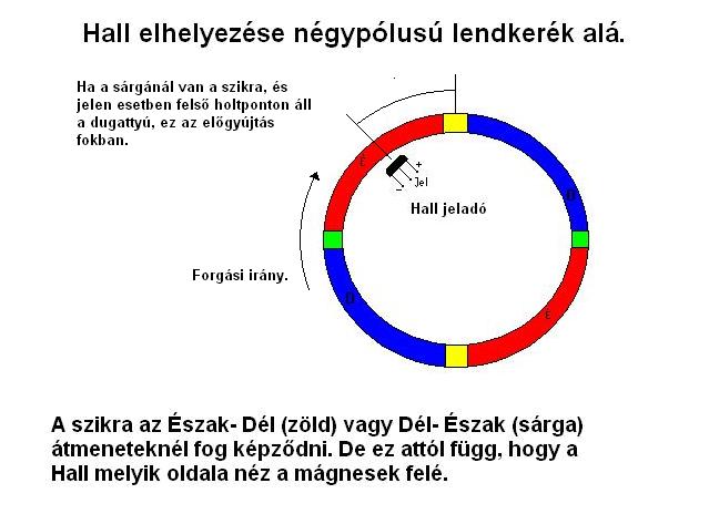Szia nyemi,- A Hall jeladó elhelyezését nem látom tisztán a lendkerék alatt. 4 db. mágnes van változó polaritással. Észak-Dél. Teljes szélességgel most. Ha nekem fordulatonként kétszer kell szikra - akkor kétszer kell szikra jel. Magyarul egy Hall jeladó kell két mágnessel és kettős gyújtótekerccsel. Mivel a Trabant-Wartburg gyújtás jelen van - egy Hall jeladó kell hozzá. Ilyet szeretnék még szerezni. De még most sem tudom,- hogy a Trabant gyújtás milyen belülről. Kell e új gyújtótekercs - vagy nem. A fix előgyújtás szerintem is elég ebben az esetben.