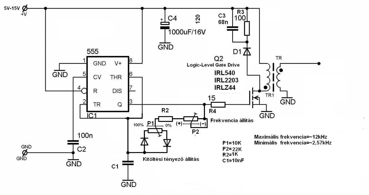 A trafóm 4,2 VA, 230/12 voltos, a c1-nem kézalatt egy 22nF kondenzátor volt azt építettem be. Nem akarok hülyeséget mondani de a freki szerintem nagy mivel most nem zug mint az előző verziónál, hanem majdnem "visit" olyan éles hangot ad ki működés közben. Értékek minden a megadott kivéve a C1 de akkor próbálkozok azt változtatni. Ja még annyi hogy fet-nek BUZ11-et használtam.