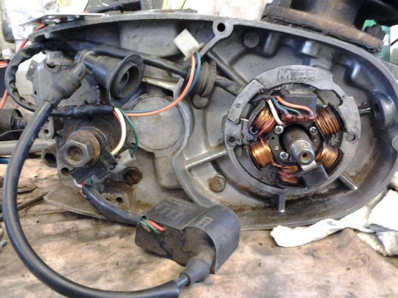 Vasgyűrű...köszi! Ívek nem láthatók. Ez egy Ducati lendkerekes elektronika. Ebben belül van az impulzus tekercs, és a gyújtás időpontját adó tekercs is. Épp ezért (is) esett erre a típusra a választás. Még nem tudom ellentétes forgásirányra ad-e szikrát (merthogy amire fölkerül az balra forgó típus), de a saját robogómon ki fogom próbálni (Ducati elektronikás ez is). A mellékelt képen látszik, hogy nem pontosan 180°-ban van elhelyezve az imp. tekercs, és a gyújtás tekercs. Ez még lehet hogy bekavar a későbbiekben. Nem tudom. Már elkezdtem a világító tekercsek áttekercselését is (szerencsére találtam hozzá megfelelő "donort"), de időközben rájöttem, túl sok mindent kellene átalakítani, hogy valamire való egységet összehozzak. Nem csak a világítást, a töltést, de még a gyújtást is át kellene alakítani. Rájöttem, hogy kevés a teljesítménye a tekercs lemezeknek. És akkor még ott vannak a szabályzó és a gyújtás vezérlő áramkörök. A cél egy - viszonylag - fordulatszám független (olyan 2000rpm-től teljes fény) 12V-os világítás nagyobb teljesítménnyel, és egy tisztességes szikra lenne. Mivel a robogó állandó üzemi fordulatra készült (kb. 6000rpm), amire fölkerül, annak meg az a végfordulata (talán...), a világítás részre is kell majd még tekerni pár menetet, hogy alacsonyabb fordulaton is rendelkezésre álljon a megfelelő fényerő.