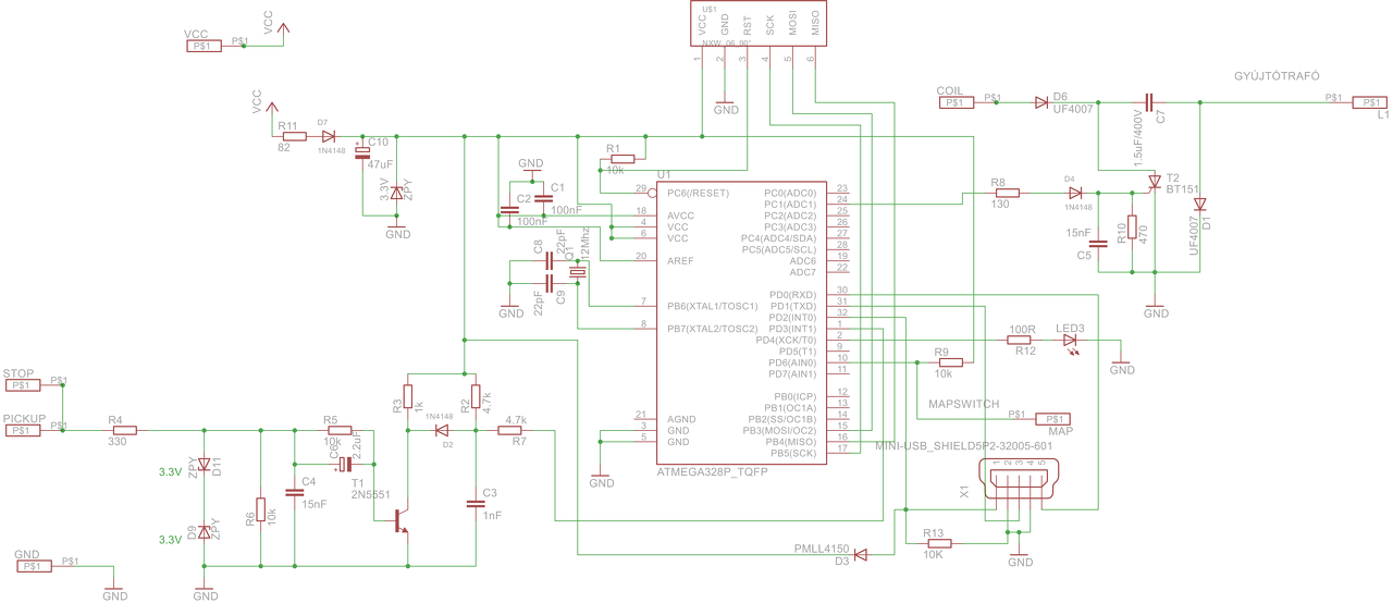 Gyanítom, hogy a tirisztor környéki rész változatlan, tehát ez egy CDI gyújtás. Magának a mikrokontrollernek 2-3mA elég, viszont a tirisztor begyújtásakor 15mA-t kér az áramkör. Ezt nem tudja kiszolgálni a táp rész alacsony fordulaton. Én magát a tirisztort is cd megoldással gyújtanám. Az ehhez szükséges energiát a gyújtótekercs adná melynek a negatív feszültségű félperiódusa most teljesen kihasználatlan! Mindjárt meg is rajzolnám! Terveztem régebben és is egy ilyen progizott CDI-t ott a teljes áramkör táplálását a gyújtótekercs adta. Kivitelezésre még nem történt meg sajnos. Érdekelne viszont az áramkör teljes dokumentációja!
