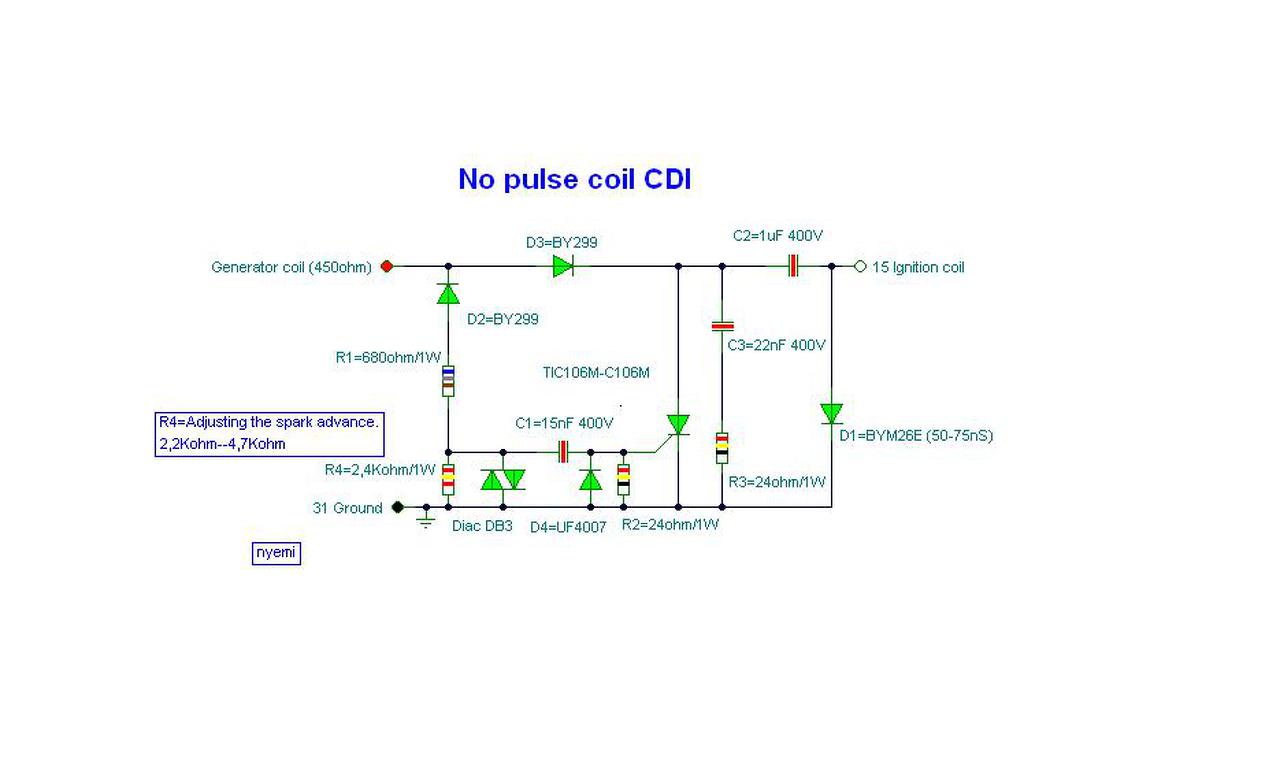 Szia. Igen ez egy analóg állítású CDI lenne. Amit az előző Simson-os videóban használnak annak ez a kapcsolása (lásd kép). Mint látható itt a negatív triggerelő feszültséget egy fix feszültségen(28-32V) gyújtó Diak végzi. A vele párhuzamos ellenállás változtatásával igaz, hogy állítható az előgyújtás húzása, de csak szűk kereteken belül.