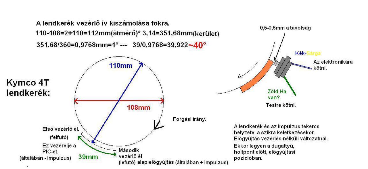 Mint látható ez egy Kymco 4t lendkerék rajza ahol 40° az ív hossza. Ez azt jelenti hogy amikor az impulzus tekercs képen a jobb oldali helyzetben van, akkor a motor alap előgyújtás kap avagy a dugattyú olyan 10-15°-nál van holtpont előtt. Amikor a fordulat eléri a megadott értéket (3000-4000 körül) át vált az ív elejére ami olyan 50-55° előgyújtást jelentene!