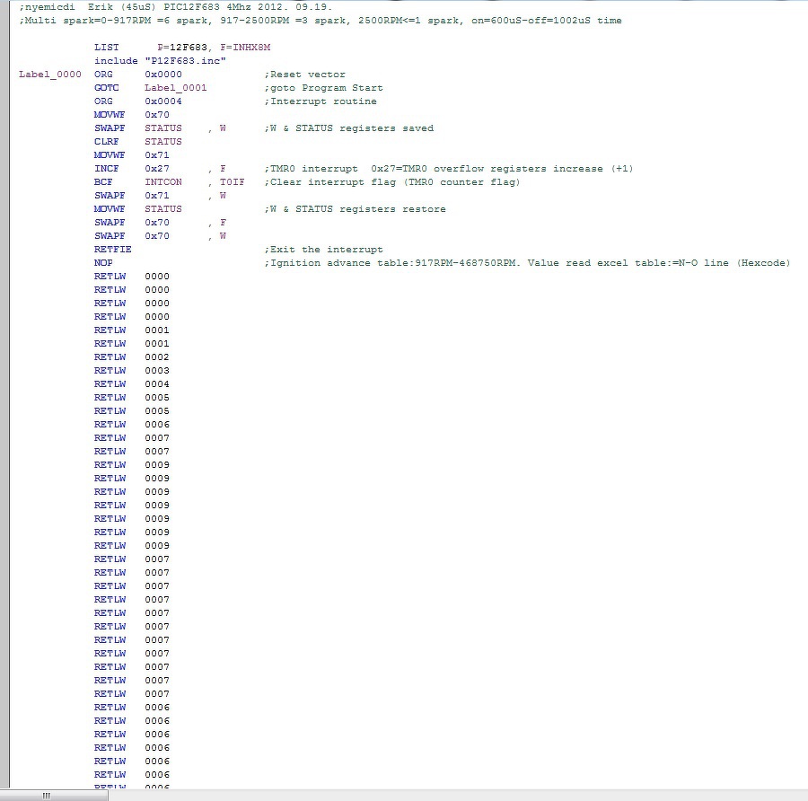 A képben látott kódrészlet alapján az a tippem, hogy a RETLW parancsok valójában az értékek tárolói. Látszik, hogy egy lassan növekvő függvény értékei vannak a RETLW-k után. A program valószínűleg úgy működik, hogy a fordulatszámot valamiképpen címkénz használva kiolvas a program memóriából egy szót, és abban van tárolva az előgyújtás értéke. Erre utal a komment is.