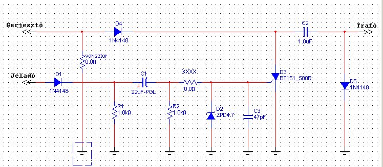 U.I.: Az elektronikában a diódák BY299-esek (csak nem volt a szimulációban), a tirisztor 600V-os, az XXX helyére rövidzár van téve (mással nem gyújt a BT151), a varisztor 400V-os (mérve szakadás, akárcsak egy új)