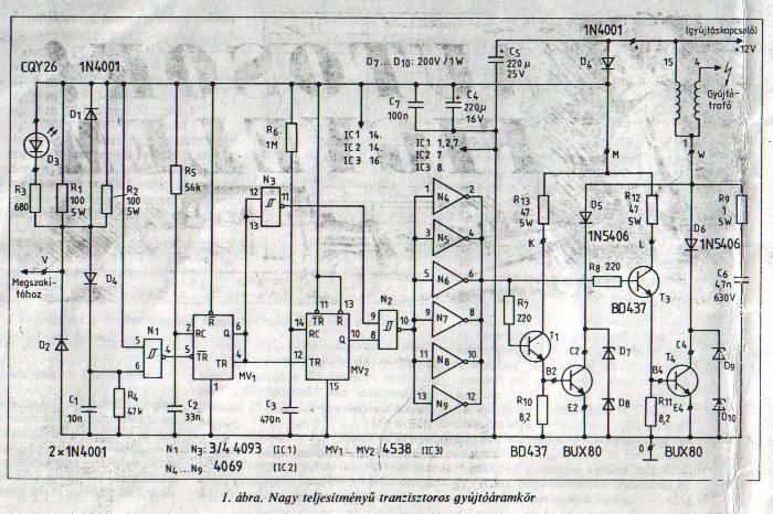A probléma a tranzisztorokkal, hogy ha a gyújtótrafó ohmikus ellenállása pl. 2 Ohm, akkor a tranzisztornak számított ellenállása ennek töredéke kellene, hogy legyen. Ha pl. 5A-nél a maradék feszültség 1V, akkor ez 0,2Ohm, ami 10%. Így akkor a 14V helyett már csak 13V-nál kevesebből képződik a szikra. Mivel szikra energia ennek négyzetes függvénye, ezért ez legalább 20% veszteség. Ezért párhuzamos tranzisztorok lennének az ideálisak. De ezeket kinyitni is elég sok áram kell, de ez talán nem akkora probléma. Ettől persze már nem lesz egyszerű az áramkör.