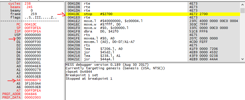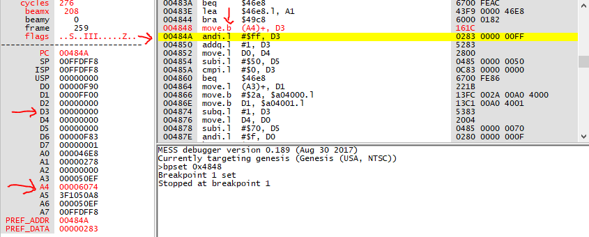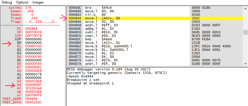 Az első képen az látható, hogy mozgatni próbálok 4byte adatot a4-ről d0-ba, közben implementálom a4-et.
