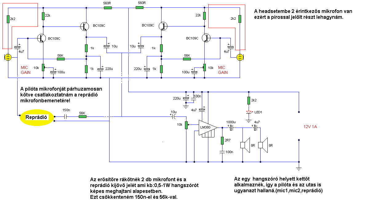 A rajz alapját a szabi83 által ajánlott link adta. Az ott található intercomot két részre osztottam (mikrofon és erősítő).A mikrofon részt megdupláztam és rákötöttem egy erősítőre. Ez a pilóta és az utas mikrofonja lesz. Csak egy erősítőt használnék, ezért beépítettem még egy hangszórót, így mindketten ugyanazt halljuk. A reprádió alapban egy kb 0,5-1w os fülhallgató hangszórót hajt meg ezért azt 150n.en és 56-k-n keresztül kötöttem be az erősítőbe. A bukómba épített mikrofon 2 érintkezős ezért a rajzon szereplő harmadik lábat az 1k-s ellenállással lehagynám. Mellékelem a képet és kérném a szakikat, hogy véleményezzétek. Mik az esetleges hibák és hogyan javítsam őket? THX! welger.
