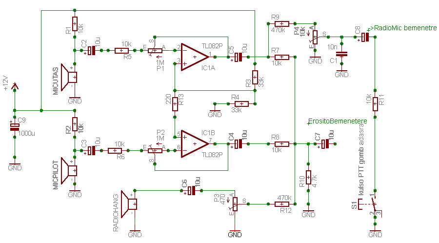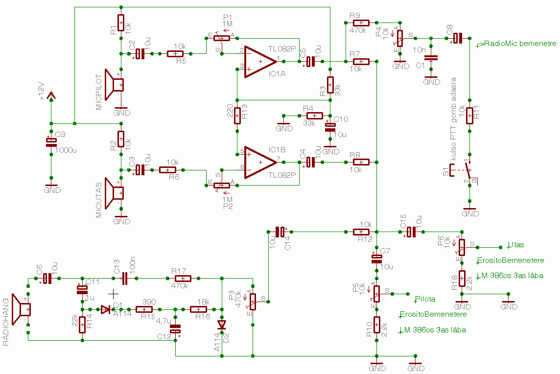 No előkerültem Közben rajzoltam 1 keverőt. Ami minden bemeneti csatornádat mikrofon utas/pilota/reprádiohangszóró rákeveri a közös erősítőd bemenetére. Közös erősítőd bármilyen erősítő lehet ami meg hajtja a 2 fejhallgatódat Utas/Pilota oldalakon. A radio mikrofonjára a pilota mikrofonjelét vezeti ki. Van olyan gyári adóvevő aminek az adásra kapcsolása így történik ahogy a PTT gombot bekötöttem a rajzon. Tehát ha a mikrofon meleg pontját 1-10 kiloohmos ellenállással a földre, negativ pontra kötöd akkor megy adásra.Ezt nézd meg az adóvevőd adatlapján lévő külső mikrofon csatlakoztatásáról szóló leírásban ha éppen máshogy lenne mindenképp nézz utána!!!!!! A UTAS/PILOTA mikrofon elektret tipusú, minden esetben így kell bekötni. 2 kivezetése van 1ik maga az egész ház ami földre megy, másik a jel kimenete.Ennek 1 munka ellenállásra kell kapcsolódnia , ez az ami a tápfesz fele megy. Ezen keresztül kap tápot is egyben. A P1 - P2 potencióméterekkel tudod az mikrofon csatornák erősítését beállítani. P3 potival a reprádió hangerejét tudod beállítani. P4-el a reprádióra jutó mikrofon jelszintjét szabályozhatod. Ui.: BOCS! mic utas / mic pilota fel cserélődött igaz elég késő volt már ...
