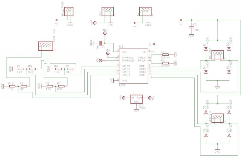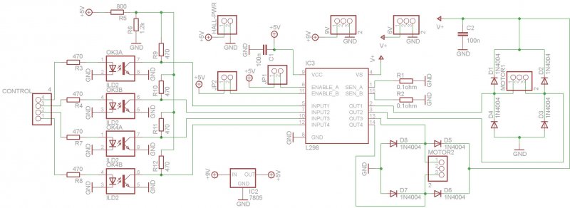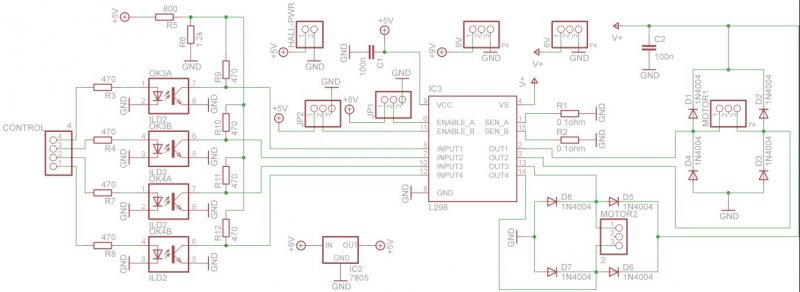 Megvettem egy L298-at inkabb, csinaltam is hozza egy kapcsolast is.. Meg tudnatok nezni, hogy jol van-e igy bekotve az IC? A bemenetekre egy feszultsegosztot akartam megvalositani, mivel 6V-al lesznek meghajtva a motorok, es az inputon 2.5V-al ez alatt kell lenni a H szintnek. Remenyeim szerint igy kb 3V jut a bemenetekre.