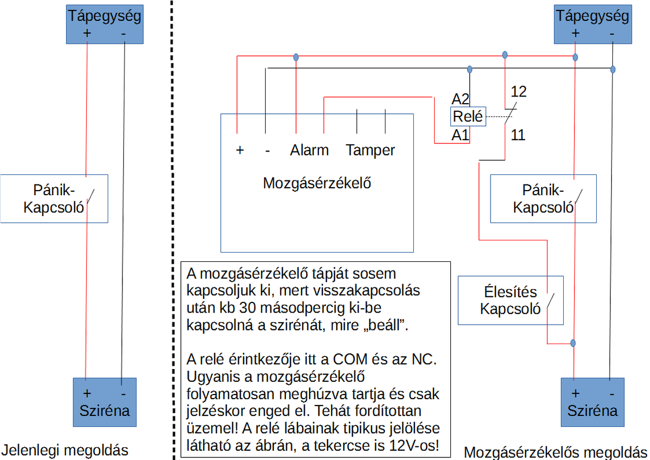 A lényege az, hogy a mozgásérzékelő tápfeszültségét nem szakítjuk meg, mert visszakapcsoláskor vagy fél percig ki-be kapcsolná a szirénát.