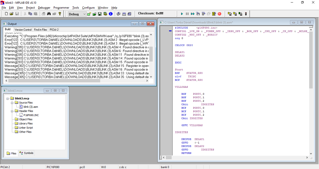 MPLAB 8.10 PIC16F690 a gyári demo panelon ami van
