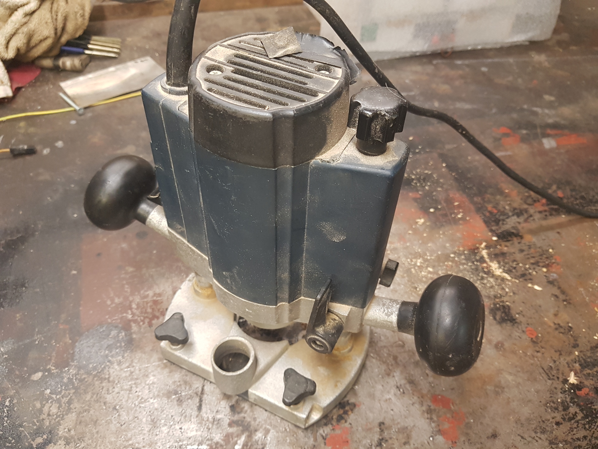 Felkeltette az érdeklődésem a nagy felsőmaróm talpának szélén lévő rádiusz. (Ritkán használom ezt a gépet, szinte mindenre alkalmasak a kis méretű egykezes felsőmaróim.) Annak ellenére, hogy teljesen nyilvánvaló lenne, az én gépem talpának szélén lévő ívek nem egy olyan körhöz tartoznak aminek a maró tengelye a középpontja. Mindkét ív egy-egy körrészlet, de a középpontjaik kb 25 mm-e vannak a maró középpontjától.
