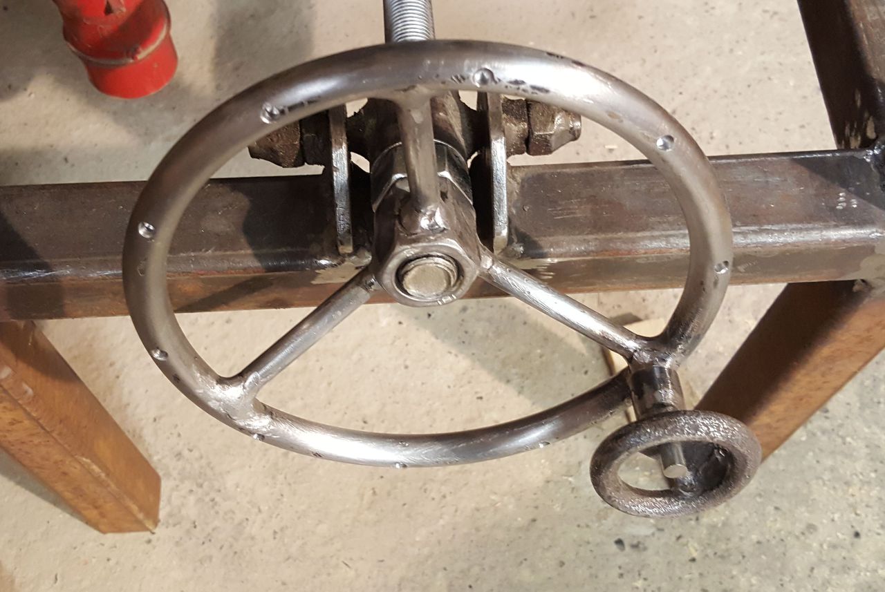 Pont ilyen jellegű megoldáson töröm a fejem, amit elneveztem "marok-tekerő"-nek. Külön praktikum esetemben, hogy ezzel éppen oldalról lehet kényelmesen tekerni (mint a mákdarálót), hiszen ott van a kerék. Még a méreteken, arányokon töprengek, illetve hogy hegesszek valamit, vagy inkább esztergált gomb lenne-e jobb.