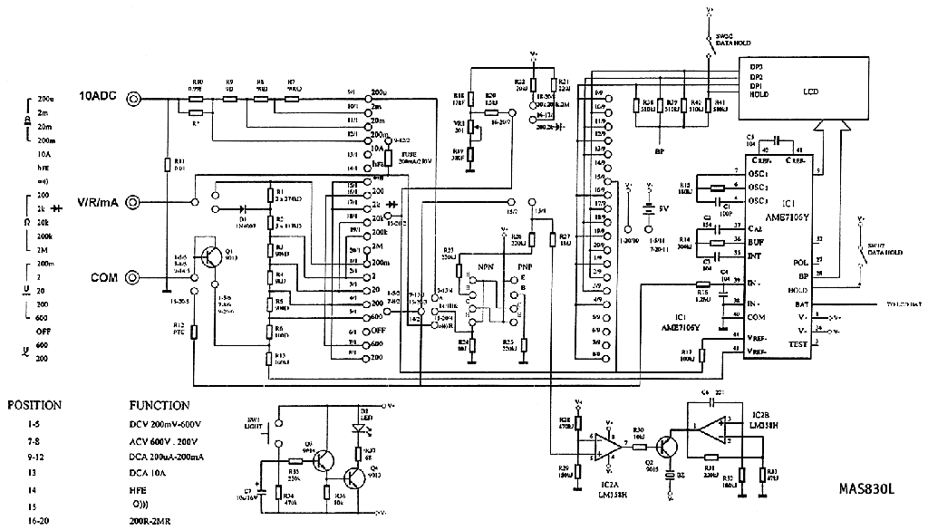 Tényleg nem a vita kedvéért,de mégis mekkora különbség van a két műszer közt?Ha tudnál szerezni kölcsön valakitől egy "jobb" műszert akkor megnézheted,megmérheted,hogy a tiéd valójában jól van e gyárilag beállítva.Először a referencia feszültséget kell beállítani,ellenőrizni az IC 37. lábán 100mV kell mérni,ha a műszer bemenetére (2V méréshatár) pontosan 1V egyenfeszültséget kapcsolsz,találsz ott egy trimmert az IC mellett közvetlen,ezt egy 1,5V elem és egy 10K lineáris potméterel kialakított feszültségosztóval tudod megvalósítani.Ha ez rendben találtatik akkor már csak a feszültségosztó lánc változtatásával lehet finomítani,ami eléggé macerás.Mellékelem a két műszer kapcs. rajzát,ha a gugli igazat mondott.