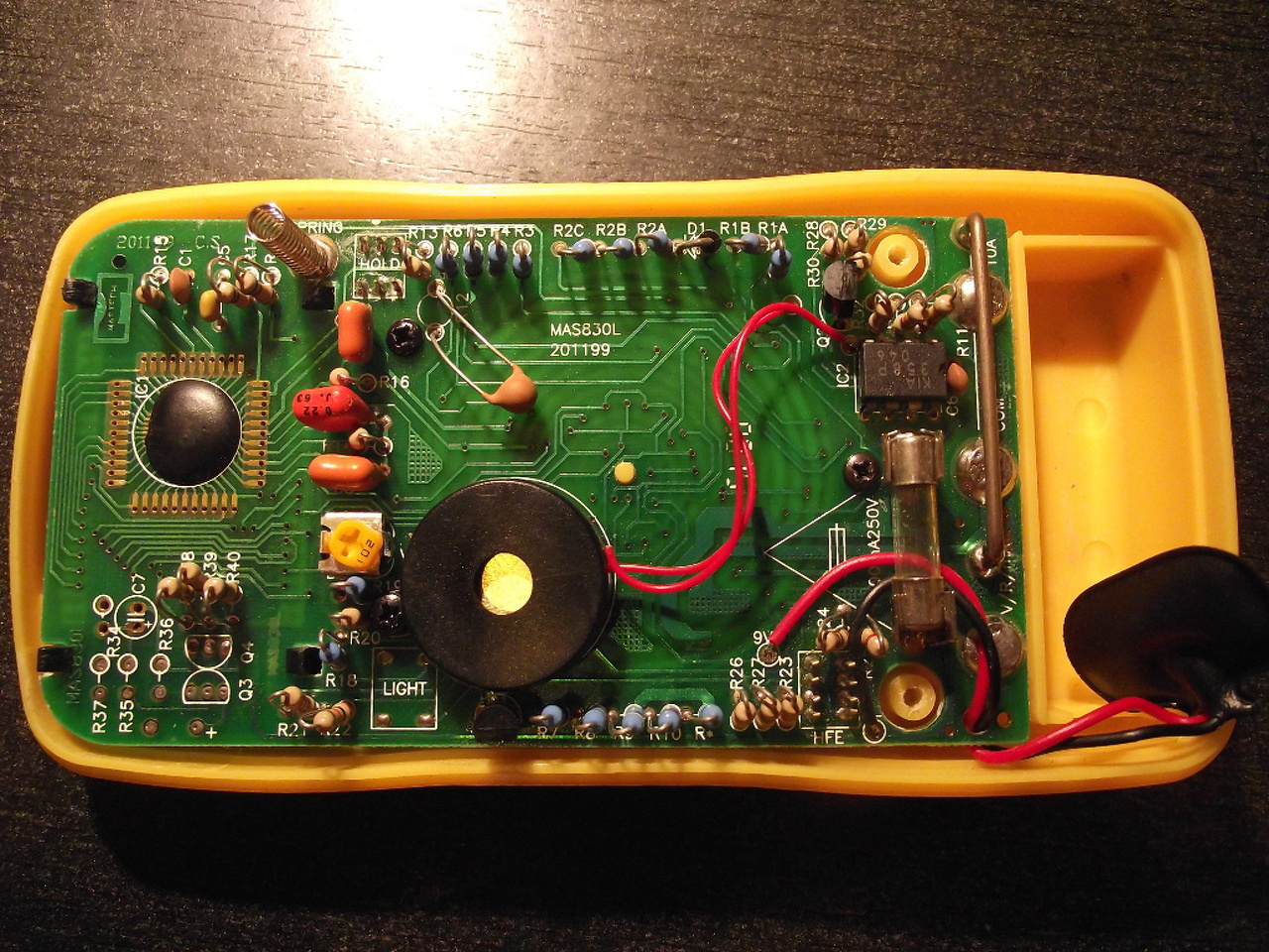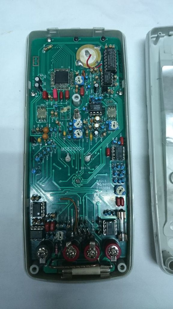 Úgy döntöttem,megpróbálok életet lehelni belé.Szétszedés után kiderült,hogy egy MASTECH MS8200G-1 panel lakik benne,kapcsolási rajzot sehol nem találtam.Cserélnem kellett az összes ic-t,2db TL062,3db. LM358,1db. TLC7555,1db. CD4011 (ezeknek foglalatot ültettem be) és a voltmérő csipet,ez egy pötty volt melyet kiköszörültem,majd belebuheráltam egy INTELSIL gyártmányú ICL7106CM44L0907DWZD ic-t (ebben megvannak a bővített funkciók),cseréltem 4db. 1N4004,1db. 1N4148 diódákat,1db. 1 ohm ellenállást,2db. 4,7µF/25V elkót és az automata zéró kondenzátorát (220nF/63V). A műszer működik,még kalibrálási műveletek vannak hátra,illetve finomítások.A képen egy merült 9V elem látható,egy másikon a Hold funkció,a többi magáért beszél,a képek minőségéért bocs.Ha valakinek lenne hozzá kapcsolási rajza és megosztaná velem,azt nagyon megköszönném!A kalibrálással kapcsolatban is szívesen fogadnék tanácsokat,instrukciókat.Mielőtt megdobálnátok kővel a tettemért,elmondom,hogy ezt egy U vasakhoz és kalapácshoz szokott lakatos követte el.