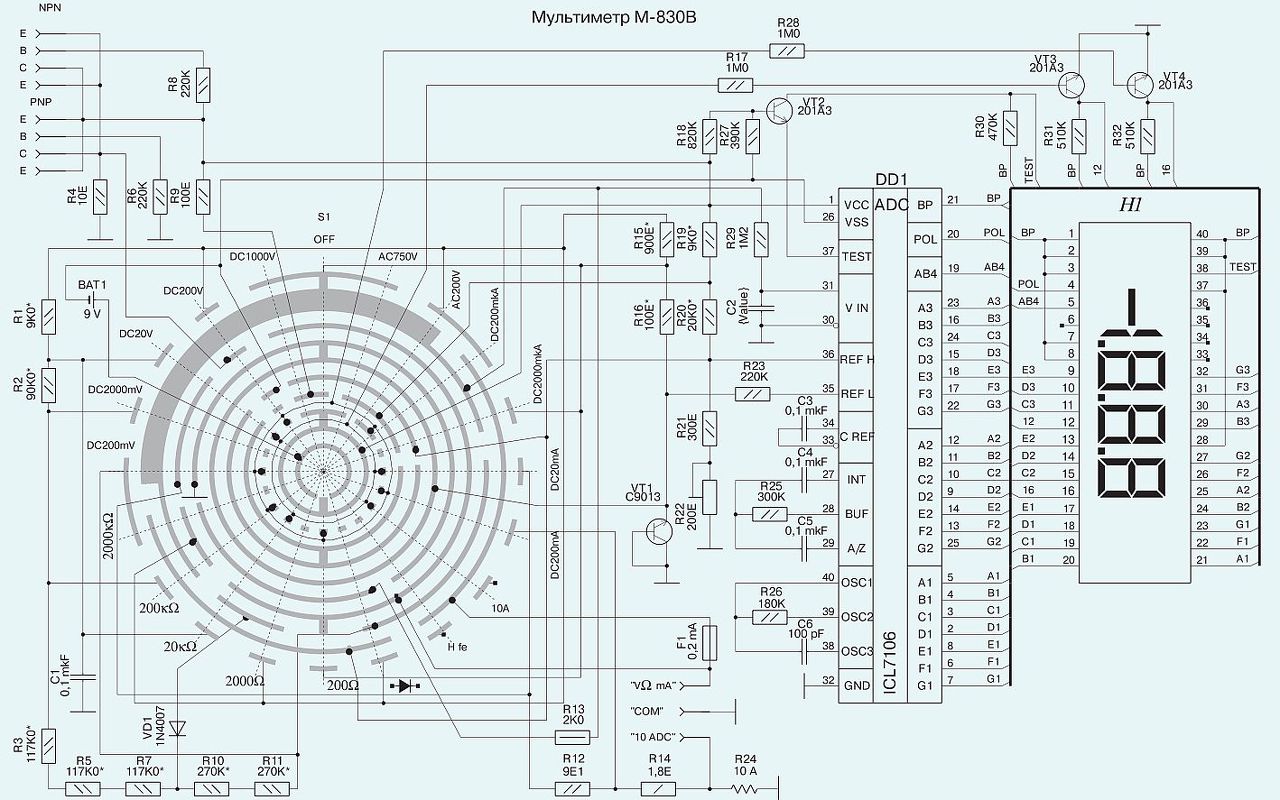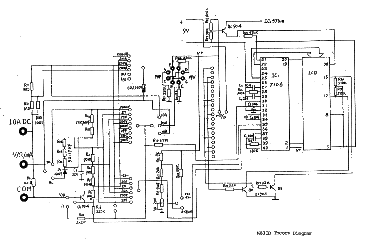 Az R7,R8,R9,R10 ellenállásokat ellenőrizd,valamint a 200mA biztosítékot.A forgókapcsoló érintkezőit is kellene ellenőrizni,keresni fólia szakadást vagy furat átvezetés szakadást.Bekapcsoláskor milyen számokat ír ki a műszer,tartja e stabilan azokat??