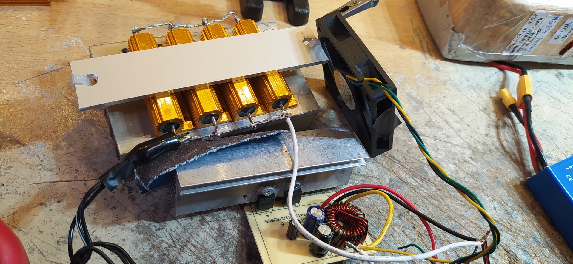 Összedobtam egy próba erejéig az elgondolást, hogy működik-e. A step down converter egy 36-72V bemenőt tudó egyszerű kis szerkezet, 12V 10A-t ad a kimenetén, ehhez raktam 4db 100W-os ellenállást, 1Ohm eredővel. A feszültség leesik 11.5V-ra (vékony kábelek miatt), az áram 9.3A, majd beáll 8.5A-nál (melegszenek az ellenállások, változik az eredő). 100W-ot disszipál, 110-120W-ot vesz fel az egész terhelés. A DC-DC converter szinte alig melegszik, az ellenállások bőven 60fokC felett vannak, de ez nem is baj. A converter kb. 7€-ba kerül, ha akarnám, meg is lehetne mókolni, egy UC3845 dolgozik benne (8lábú), egy Mosfet egy dióda meg egy tekercs, szuperül összeválogatva. Az UC3845 egy soros ellenálláson van megtáplálva a bemenetről, aztán a kimenet egy diódán keresztül ad neki stabil tápot, így tud járni az IC magasabb feszültségről is. Ötletes. Már csak egy szép dobozolás kellene neki, szépen elrendezve, aztán mehetne is a szériagyártásba