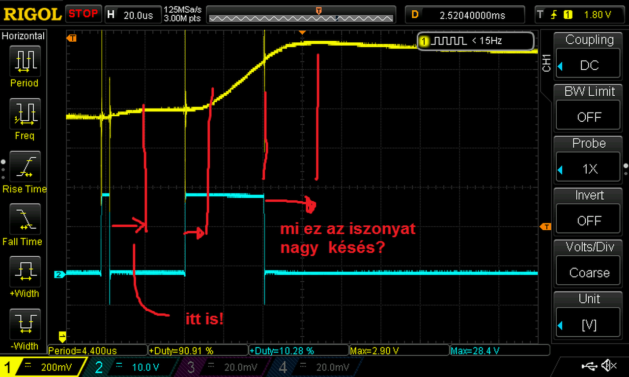 Amit beírtam reggel, meg sem nézted.. ott pont szépen látszik a 10 us késés a bemeneti "négyszögre" adott válasz a kimeneten, amit reklamálsz.