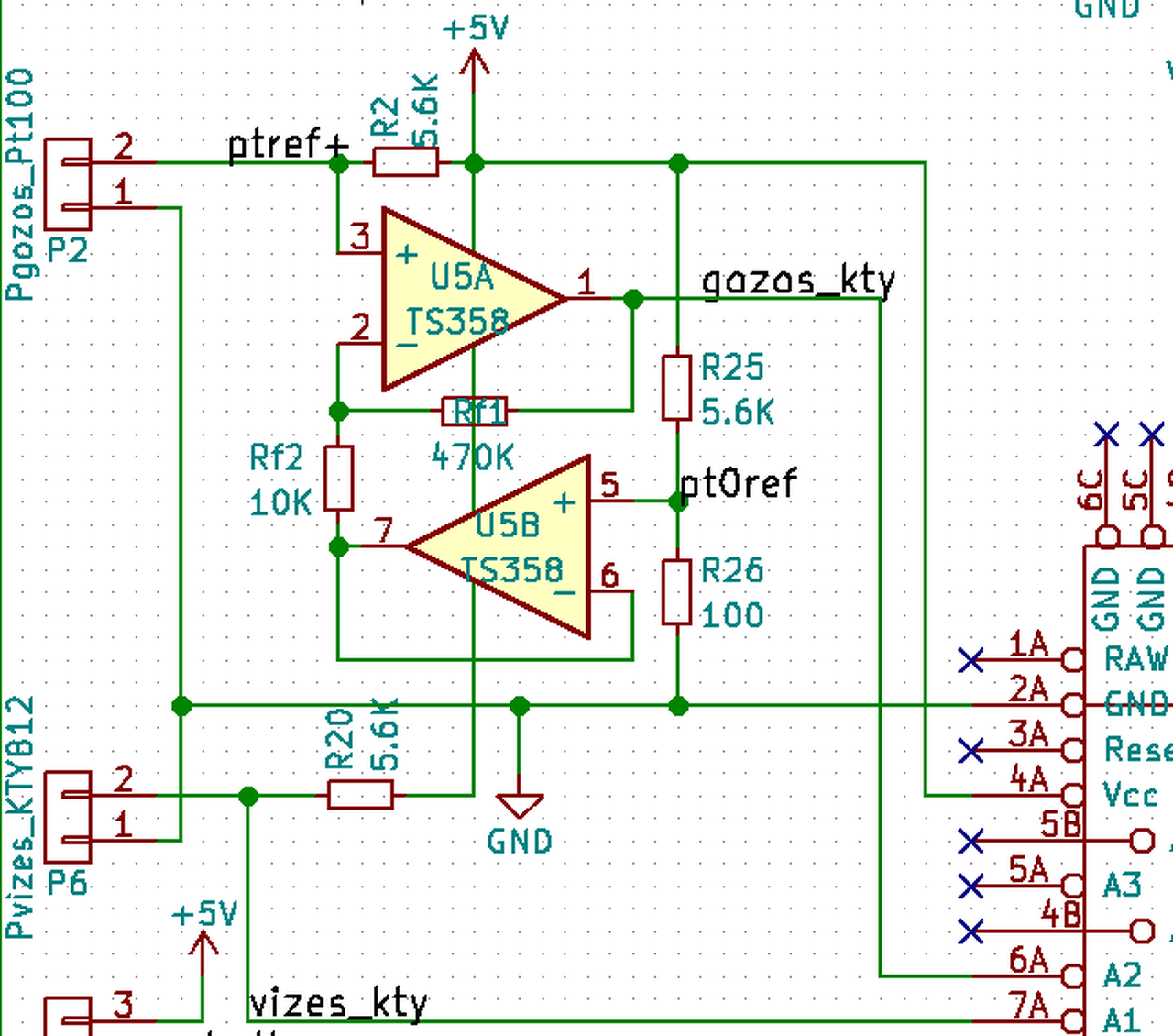 Adott egy feszültségosztóban lévő pt100 Arduino ADC-re kötve, az elfogadható felbontás érdekében műveleti erősítővel. Egy másik porton kty81-200 ugyanúgy feszültségosztóban, erősítő nélkül. A probléma, hogy a a nyákon lévő relé bekapcsolásakor kissé leesik a tápfeszültség és ilyenkor az ADC-vel mért érték stabilan megemelkedik (~+1%). Ez a jelenség csak az LM358A-n keresztül van, a kty feszültségosztóján nem lát változást az ADC, tehát nem ott a baj. Segítsetek légyszi; miért nem lineáris a kapcsolásom a Vcc=Vref=4..5V tartományban? Szimulátorral (QUCS), ideális alkatrészekkel nem tudom reprodukálni a hibát. A hozzászólás módosítva: Nov 22, 2016