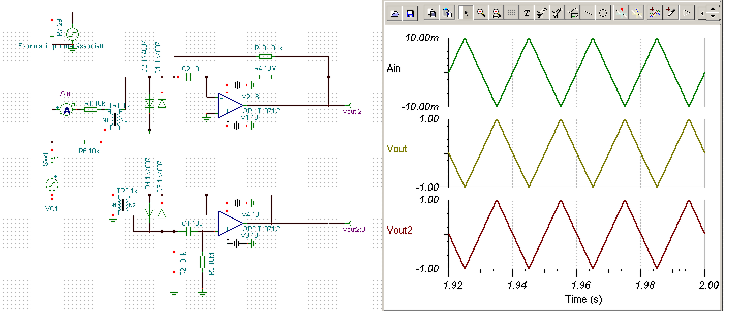 Kipróbáltam a gyakorlatban is azt az áramváltó erősítőt, aminek korábban beraktam a szimulációját. A tapasztalatok vegyesek. Kétféle áramváltóval próbáltam. A negatív bemenő impedancia az egyik áramváltó esetében használható csak, a másikkal instabil lett az áramkör. Ezért az ezt megvalósító ellenállásokat végül kikötöttem az áramkörből. Ettől eltekintve a DC csatolt megoldás az offset servo-val jól működik. Kb 100µA primer áramnak megfelelő zajt szedett össze egy 230V-os áramkörbe beiktatva. 0,5mA-400mA primer áram tartományban mértem, és pontosan az áramerősséggel arányos feszültséget ad.
