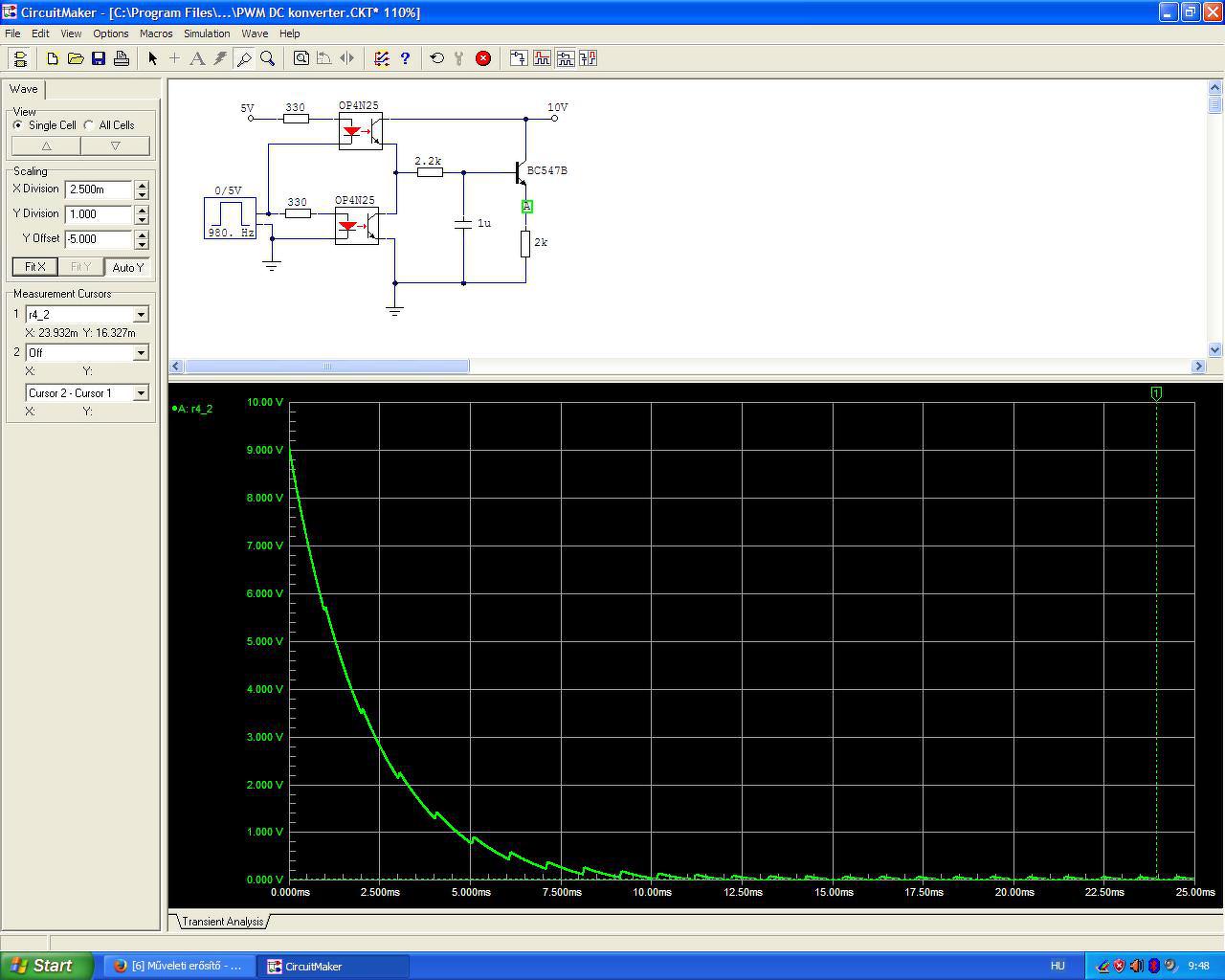 Idézet: „- A bázis-emitter közötti 10k nem szükséges. Ezzel a frekiátvitel növelhető, de közben a CTR tényező rohamosan csökken. Így a szaturációs maradék feszültség nő.” Ne felejtsd el, hogy a ki/be kapcsolási meredekség nem egyforma, így ha nem elég gyors a periódus időhöz képest, akkor ez önmaga viszonylag nagy hibát vihet be, a teljes tartományban, míg az esetleges maradékfeszültség csak a szélek felé jelentkezik! A CTR csökkenése a legkisebb fájdalom itt