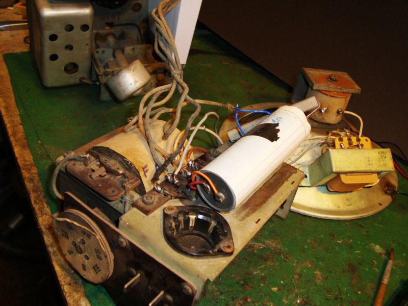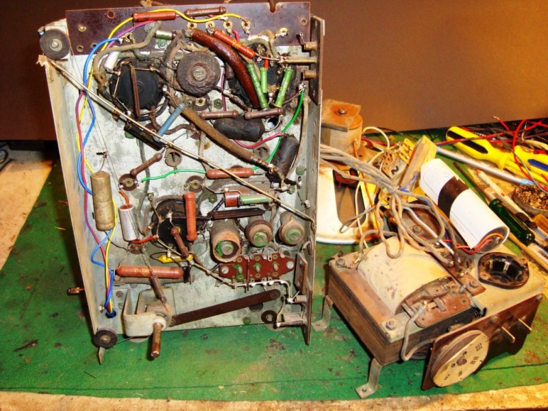 Orion 044: Bár a felújitást januára terveztem, nem birtam ellenállni megint, és kinyitottam, azzal a szándékkal, hogy legalább megszólaltatom, ha tudom, hogy látni lehessen mi kell még hozzá, mit kell majd csinálni vele. Felépitésében, ez egy igen egyszerű készüléknek látszott elsőre. ECH 2 keverőcső, EF 8 KF- erősitő, és EBL 1 végcső. Tehát mind egy néprádió, csak régebbi csövekkel. Gondoltam, ebből nem lesz valami nagy teljesítmény, meg érzékenység.