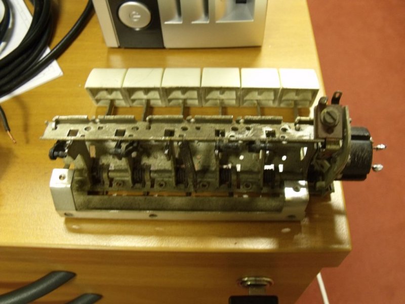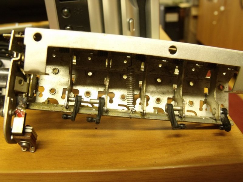 A sávváltó kapcsolósor tisztítása következett, bántotta a szemem, hogy olybá tisztátalan (finoman fogalmazva), illetve nemes egyszerűséggel mocskos mint a bűn. Ezért gondoltam, hátha ki tudom szerelni, bár ez egy elég kockázatos művelet (mi van ha szétugrik millió rugó és az életbe többet nem tudom összerakni?) de aztán erőt vettem magamon és .... leforrasztottam a hálózati kapcsoló kábelét; leforrasztottam egy segédkapcsoló kábelt; oldottam a csavarokat, ami a vázhoz erősíti a kapcsolósort; kitoltam a műanyag vonófejszemeket, amelyek a tolókapcsoló furatába mennek; a szabaddá vált kapcsolósort így ki lehetett emelni. A zsíros, olajos felületre az évtizedek alatt rárakódott por és kosz jótékonyan védelmezte a fémet, de a nitróhígító hatására kénytelen kelletlen volt távozni, melynek során az évtizedes elfoglalt helyet kellett otthagynia szegény mocsoknak. A tisztítómosás ecsettel történt. A száradás után WD40 következett, lassan befedte a felületeket óvatosan ráfolyatva. (a permetezőfejet nagyon érzéssel kell lenyomni, akkor nem spriccel.) Leitattam a felesleget kézszárító papírral, majd az összeszerelés következett, fordított sorrendben. A kezdeti állapot: