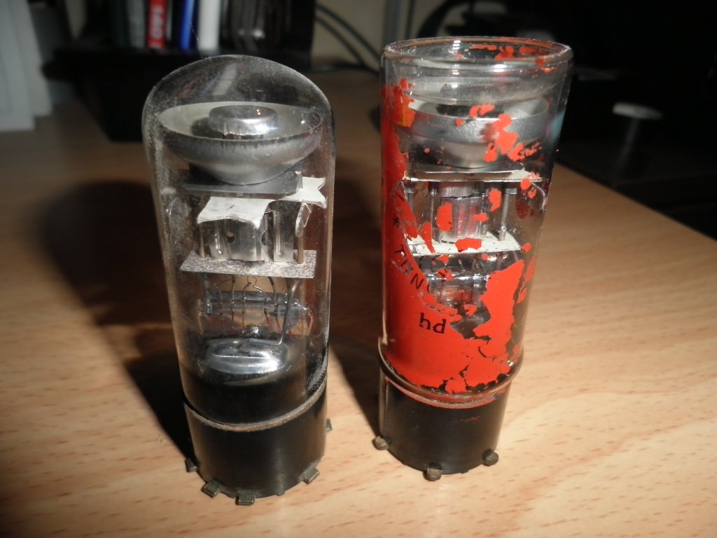 Nem feltétlenül, lehet hogy a bakelit foglalaton belül van valami ami zörög. Nekem is van egy körmös csövem ami zörög de semmi baja elektromosan. Egyébként a jobb oldali is valószínűleg EM4-es, de ebből a pirosból van olyan is aminek nem 2 "levele" van hanem csak 1 nagy. Azt nem tudom milyen típus.