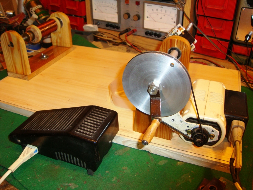 Üdv mindenkinek. Kb 2 hete írtam, hogy készítettem egy méhsejt tekercselőt, hát most itt a párja. Ha lúd legyen kövér alapon, meg ha már úgy is elöl voltak a szerszámok, alkatrészek, nekiálltam a régi trafó tekercselőm újjáépítésének is. A régi tekerő még 1953-ban készült, akkori lehetőségek szerint, azon tanultam gyerekként tekercselni. Szóval már az is muzeális, bőven kiszolgálta az idejét. Ez egy elég egyszerű szerkezet, csak a számlálót kellett kicsit komplikáltabban gyártani. A Az alap egy nullázható magnó számláló, a csigakerék egy villanyórából való 1/10-es áttétel, a többi a bontott videók maradék fogaskerekei. Az egész egy bútorlapra van csavarozva, a csapágyak kétszer zárt 6000-ek. Egy vásárba vett varrógép motor a meghajtó, lábpedáljával együtt.Azt hiszem a részletes képek mindent mutatnak nem kell többet magyaráznom.