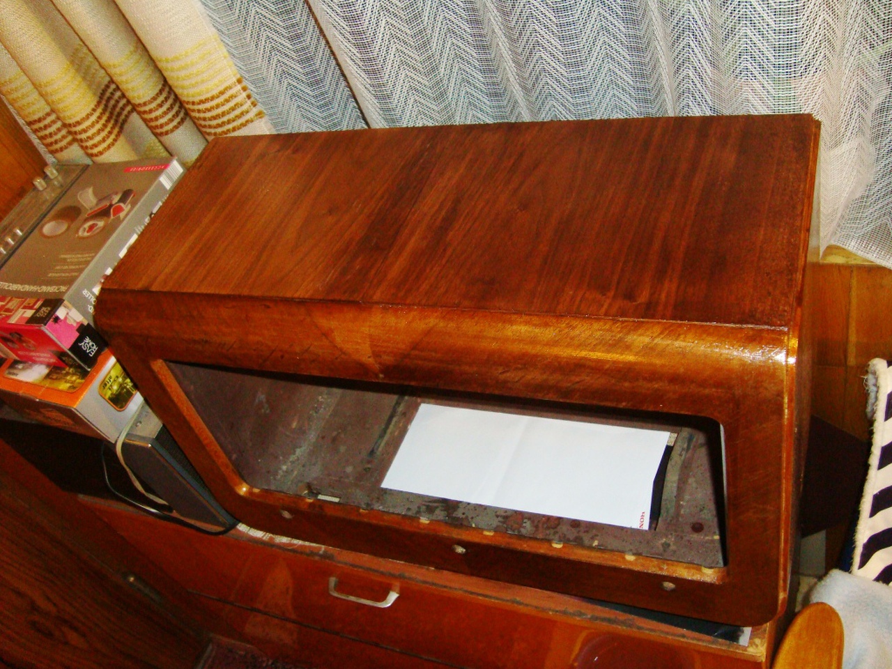 Foly.443. Szóval a doboz. Tegnap reggel lemartam róla chromofaggal a régi festéket, aztán elautóztam vele kedvenc asztalosomhoz. Mikor meglátta a tetején a panelkittet olyan lett a képe, mint aki citromba harapott. Nem részletezem, nem vállalta. Fő indoka, hogy a szürke valamihez úgy sem ragad a faragasztó, és ha pácoljuk feljön, stb. De legalább adott furnírt, hogy próbálkozzam egyedül. Igaza lehetett ezért nem is faragasztóval kentem, hanem Palmatexel, a rádiót és a furnirt is. Száradás után összeillesztettem, ezt csak egyszer lehetett megcsinálni, utólag ha nem pontos, már nem lehet felszedni. Sikerült. Némi száradás után lepácoltam, egész jó lett. Egyszer van még csak lelakkozva, holnap még többször kell csiszolni, meg lakkozni, de már látszik az alagút vége.