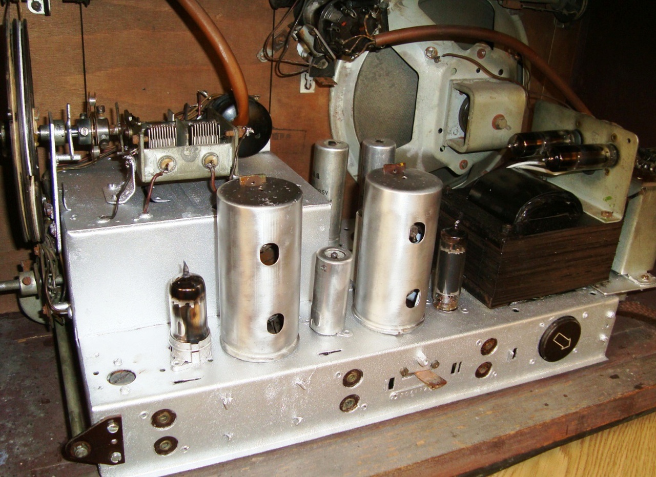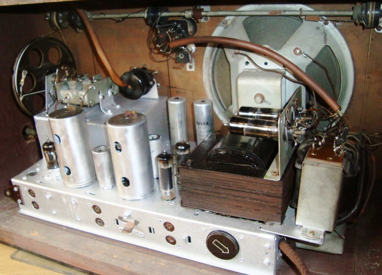 Hát igen, ez a készülék, Rákosi korszak egyik szuper gépe volt, nagy népszerűségnek örvendett, de azért látszik rajta a szegénység. Valójában ez is ellenütemü csak nem egy phuss-pull meghajtással, hanem egy takarékos , szükség megoldással. Ezzel egy csövet spóroltak. Az egyik végfok anódjában van egy plusz 330 ohmos munkaellenállás, és az ott képződött jelet vezetik a másik végcsőre, ami ugye az erősítés mellett fázist is fordít, tehát a kitrafó másik felére ellenütemben kerül a jel. Persze sántít a dolog, mert ott meg nincs az a plusz 330 ohm, tehát a két oldal nem teljesen egyforma. De akkor még nem volt Hi-Fi és egyébként is a hangszóró eleve többet torzított mint a sánta végfok. Külön probléma, hogy a gondosan beüvegezett előlap miatt egyébként is romlott a hangminőség. De akkor ez számított a rádiózás csúcsának.