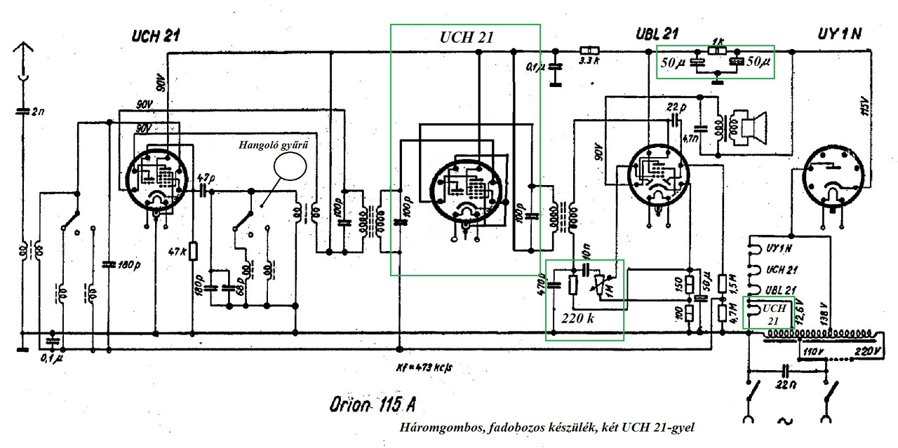 A rajzon 1 hiba biztosan van. Ha 2 db UCH csöves, akkor a fűtéskörön a 12,6 V-os leágazást el kell távolítani, mert az UCH-k fűtőfesze 20V (az UF21-é 12,6V lenne), így tejes kőr kiadja a cca. 140V-ot (de pláne 230V-os hálózatból). Mik a többi különbségek?