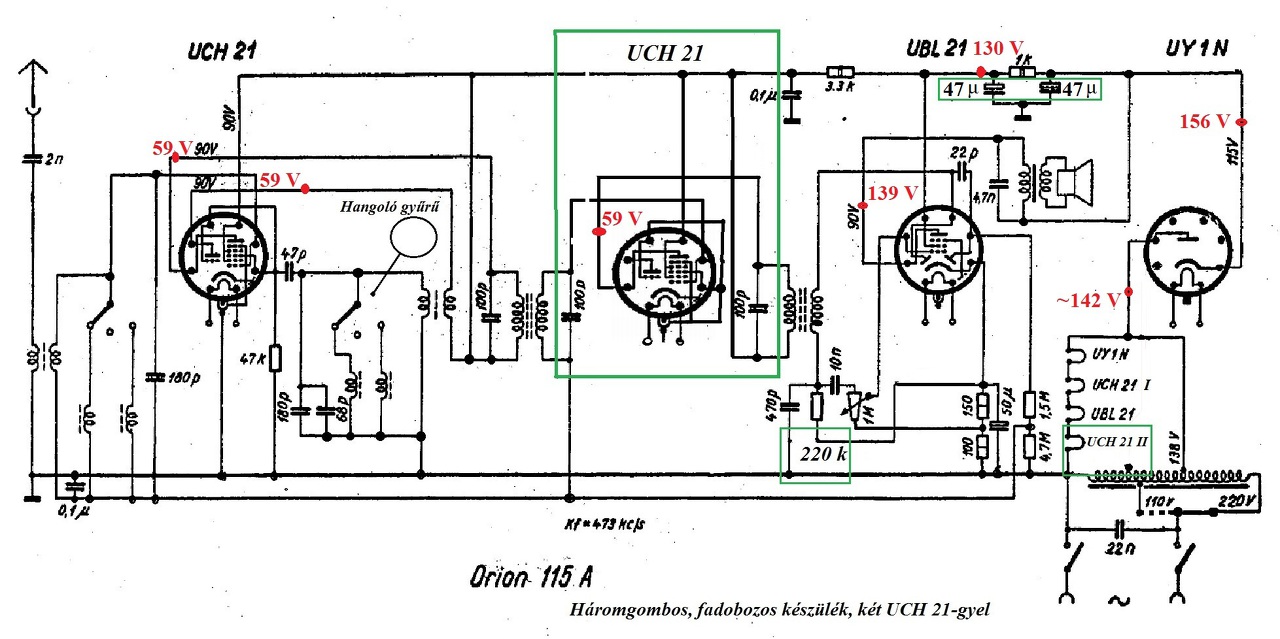 Segítséget kérek még egyszer a Néprádió jó ismerőitől. A két UCH-val szerelt készülékem többszöri feltérképezése után megrajzoltam a kapcsolását (mellékelt fotók, bekeretezve az eltérések a közismert alapkapcsolástól). A teljesen tönkrement 50+50-es elkó helyére 47+47 került. Most a brumm minimális, a Kossuth és a Petőfi nagyon halkan (majd egyre halkulóan) szól 4-5 m-nyi antennával (80, ill. 15 km-re vannak az adók). Az UBL-re HF jelet adva egy zsebrádióból nagyon szép, telt hangon erősít, a hangerő stabil.