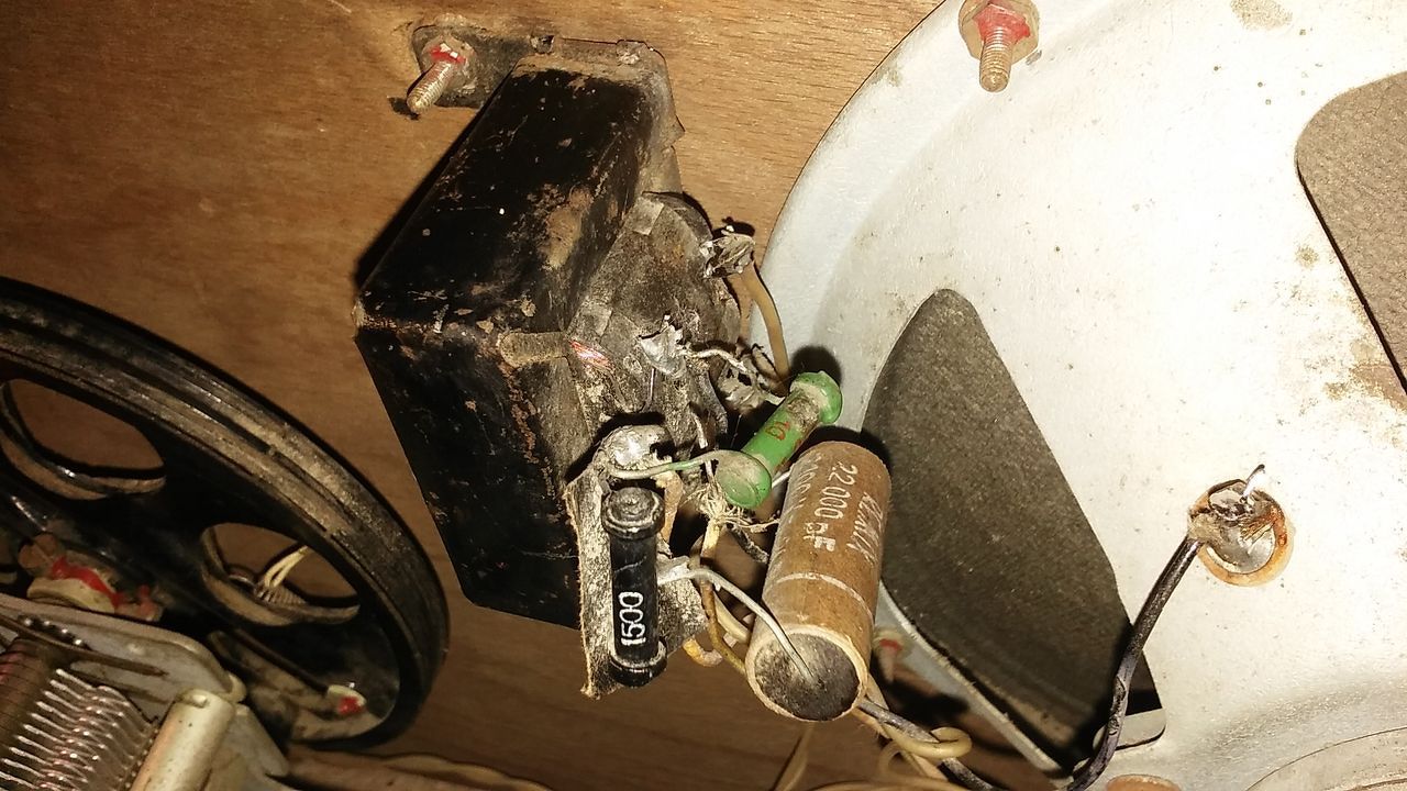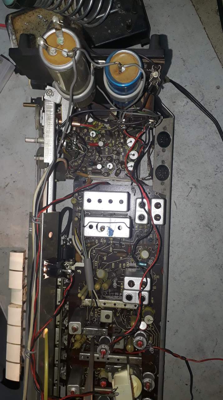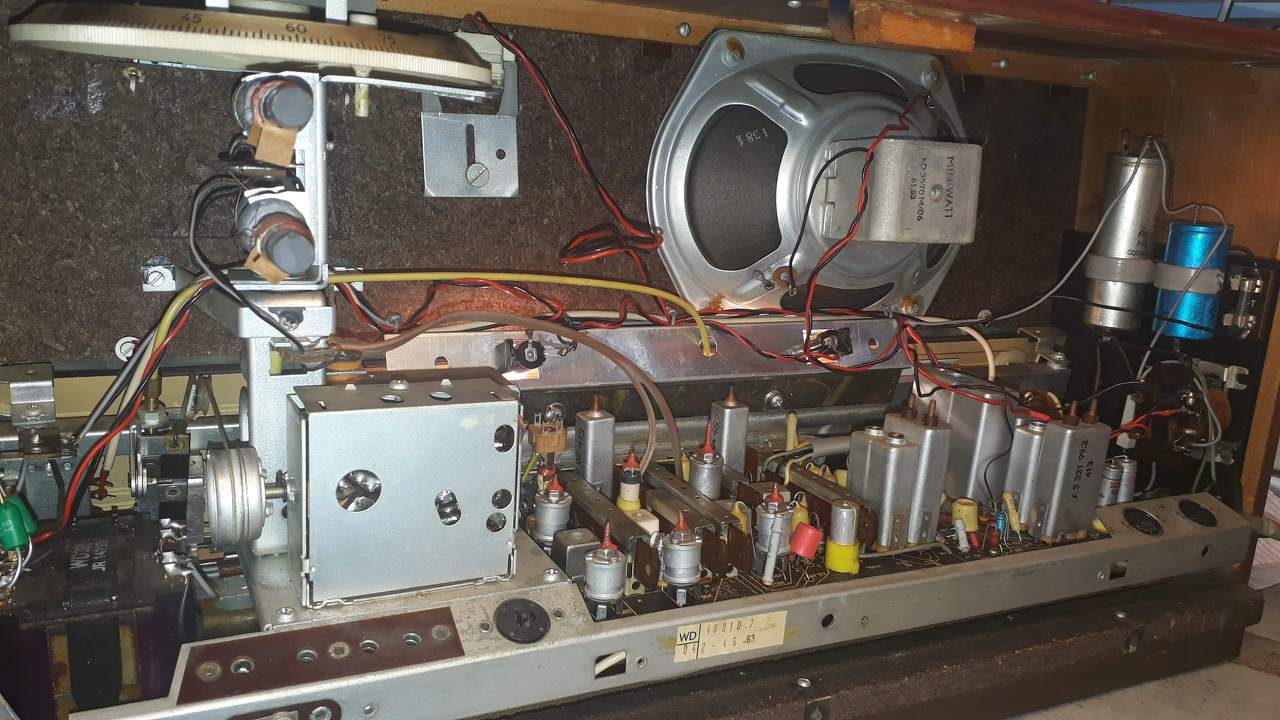 Nagyon szép állapotban van a belseje (leszámítva a kimenő trafót és környékét, mert az nagyon kókány munka). Viszont a doboz az szépen vízkáros.... a furnírozás is oda van rajta amit csak cserével javasolnám javítani (egybe csiszolni, lakkozni esetleg politúrozni)