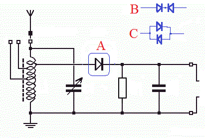 A B eset: a szembefordított két dióda, mindíg zárva van egy réteg. Csoda lenne ha szólna. C eset: szólni ugyan fog, de nem fog egyenirányítani, valószínűleg halkan, a két dióda aszimetriájának megfelelően. Az eredeti kapcsolás korrekt, jó megoldás, az antenna, és a demodulátor dióda terhelési viszonyainak (leágazás) optimális megválasztásával érhető el a legnagyobb hangerő. Ennél nagyobb hangerő feszültség kétszerező demodulátor kapcsolással érhető el. A hozzászólás módosítva: Szept 4, 2018