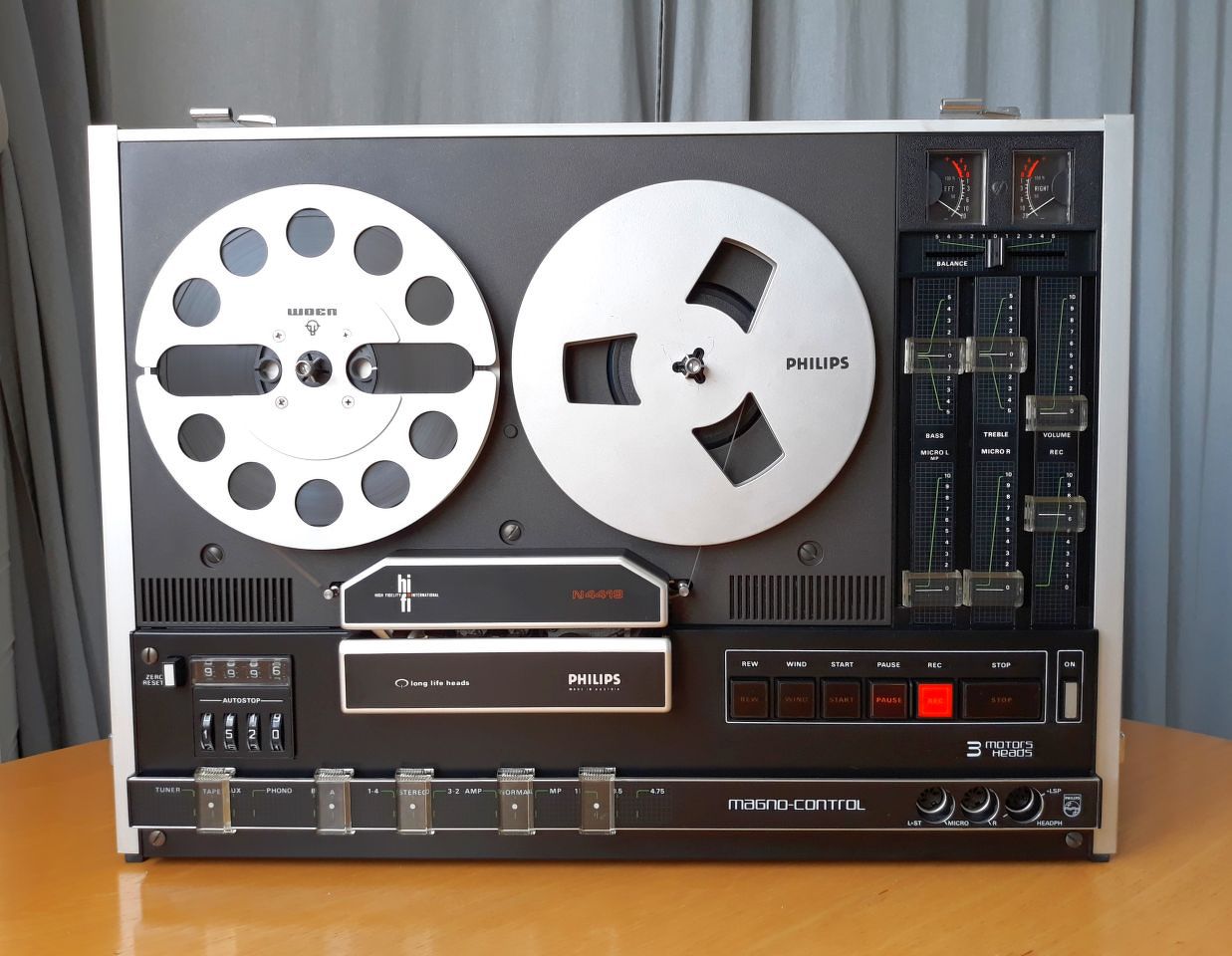 Szerencsére a Philips a hetvenes évekre kijött a hárommotoros mechanikájával, amit már sokkal jobban lehet szervizelni elektromos és mechanikai szempontból is. Szépen, kihajtható az egész elektronika, működés közben mérhető. A mechanika is szépen kivehető. Sajnos egy nagy rákfenéjük van: az ékszíjak 40 év után folyós bitumenné válnak. Ennek a kitakarítása rémálom. Az idén egy ilyennel én is megküzdöttem. A képeken a felújítás előtti és utáni állapotok láthatók. Volt vele munka bőven: a vezérlés javítása, a felvevő-lejátszó erősítő újra beállítása, kisebb-nagyobb kontakthibák elhárítása, a mechanika teljes szétszedése-újrakenése, a szétfolyt gumikról nem is beszélve. Ez a magnó ennek a szériának a csúcsgépe. Elektronikusan vezérelt a mechanika összes funkciója, mely távvezérelhető is, a capstan motor sebessége is elektronikusan szabályzott, valamint a lejátszás és gyorscsévélés üzemmódokban is elektronikusan vezérelt a szalagfeszítés. A szalagokkal leheletfinoman bánik, és nem utolsó sorban gyönyörű a hangja. Három fej, három motor, három sebesség.