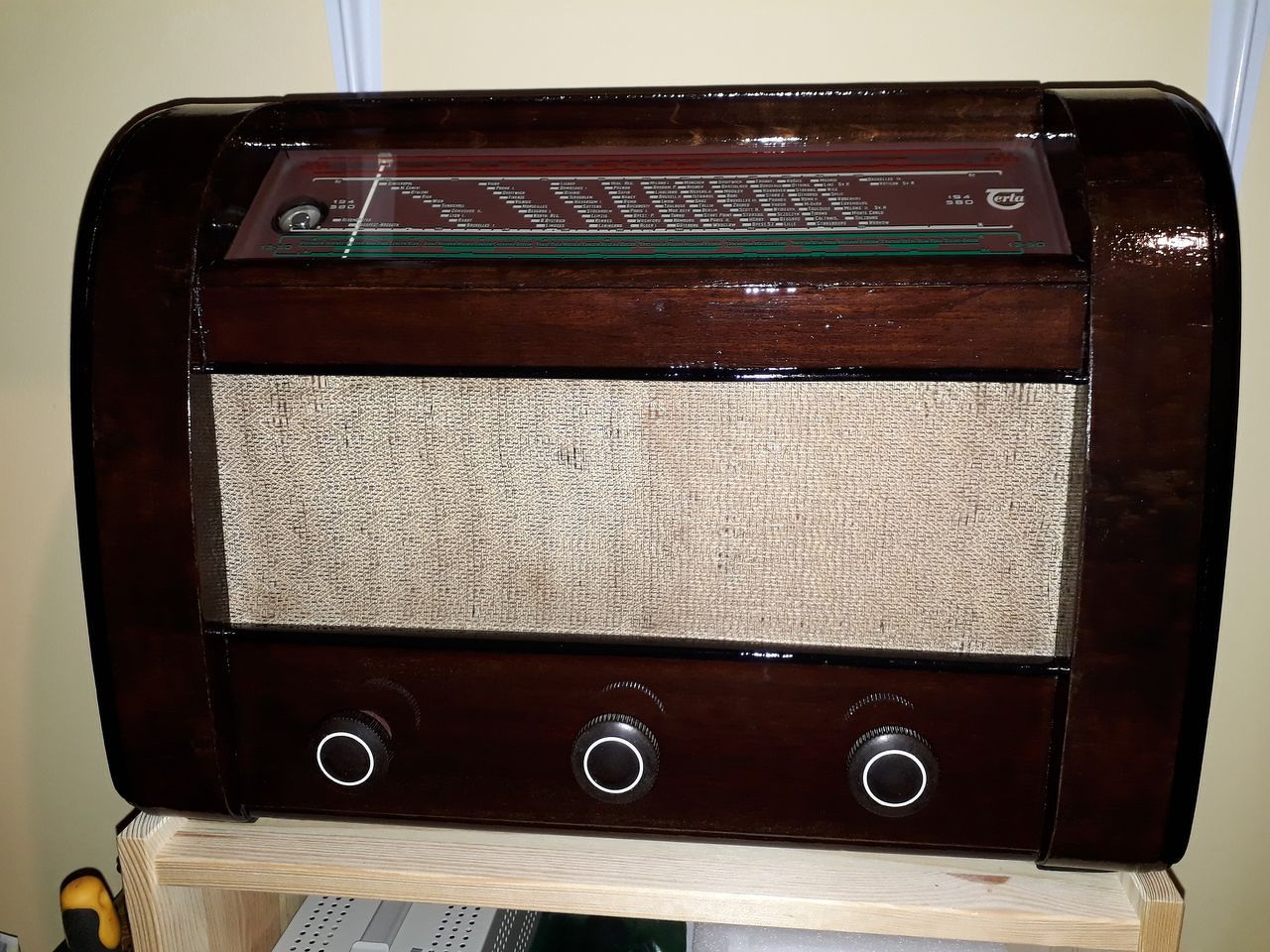 Lassan de biztosan elkészült a Terta. Nagyjából két hét ment el a végleges lakkozásra a száradási idők miatt, amire jócskán rá is hagytam, hogy biztos legyen. A hangszórót szét kellett szednem mert tele volt összeállt porral és szemcsékkel ami miatt kissé szorult a tekercs, szólt ugyan de kis hangerőn torz volt a hang mint amikor kézzel lefogom a membránt. A mágnes egyik sarkán van egy nyílás gyárilag, hogy miért azt nem tudom, ott juthatott be a kosz. Tisztítás óta szépen tisztán szól. Amennyire lehetett megtisztítottam a szövetet, ha menthető ragaszkodni szoktam az eredetihez, legvégül a gombok alatti filceket és a gombok csíkjait meg a sávváltó feliratait festettem újra. Boldog karácsonyt, és rádiókban gazdag új évet kívánok mindenkinek! |