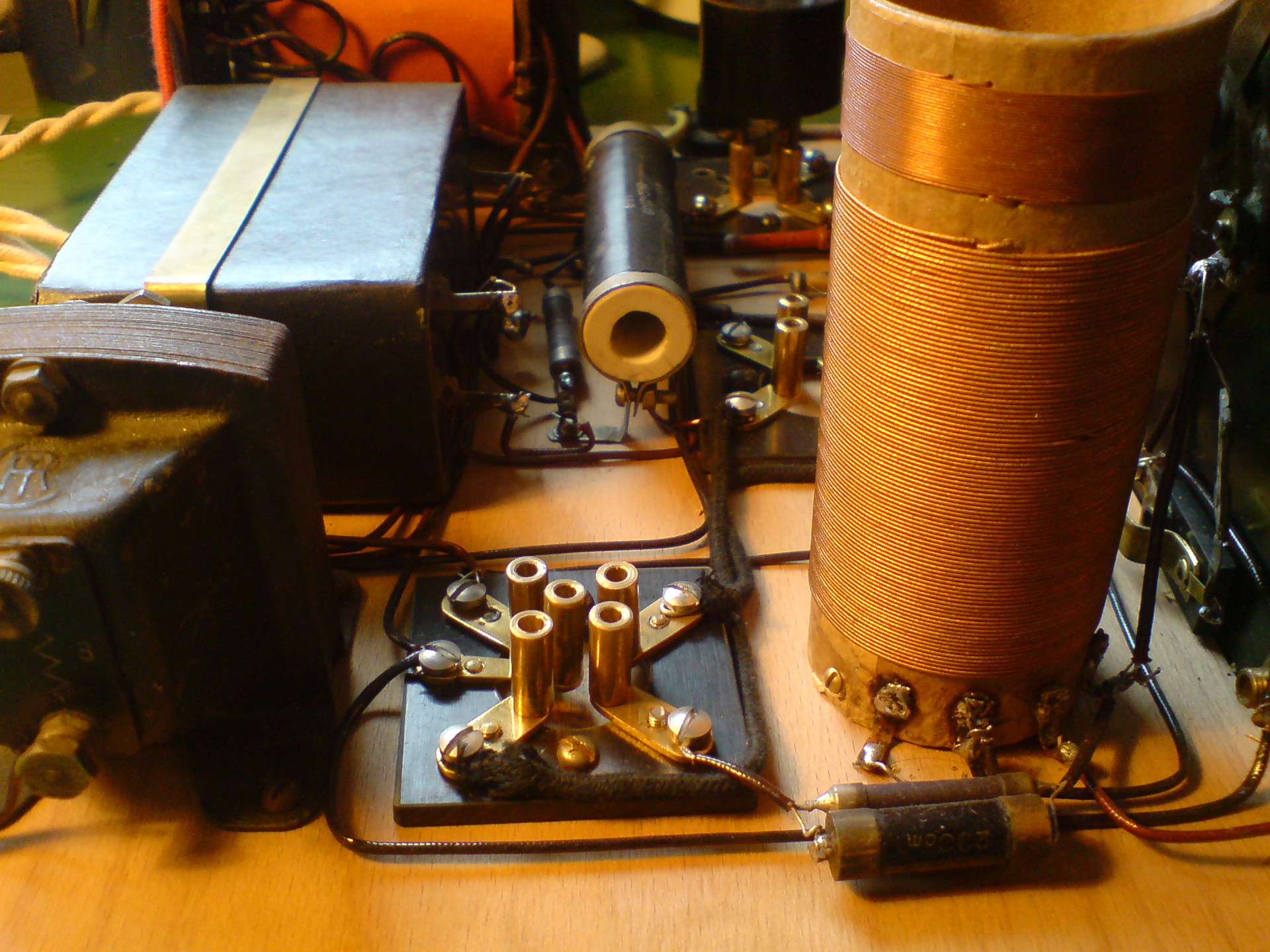 Addig is összegyűjtöttem pár korabeli építési leírást, hátha valamelyik megtetszik. A képet megnézve eredetileg árnyékolt rácsú cső lehetett az első fokozatban. Az árnyékoló fémlapon egy lyuk is van a számára vágva, hogy a ballon tetején lévő anódkivezetés a lehető legrövidebb kábellel menjen az audion fokozathoz. Ehhez hasonlót is fogok küldeni. Első adag: