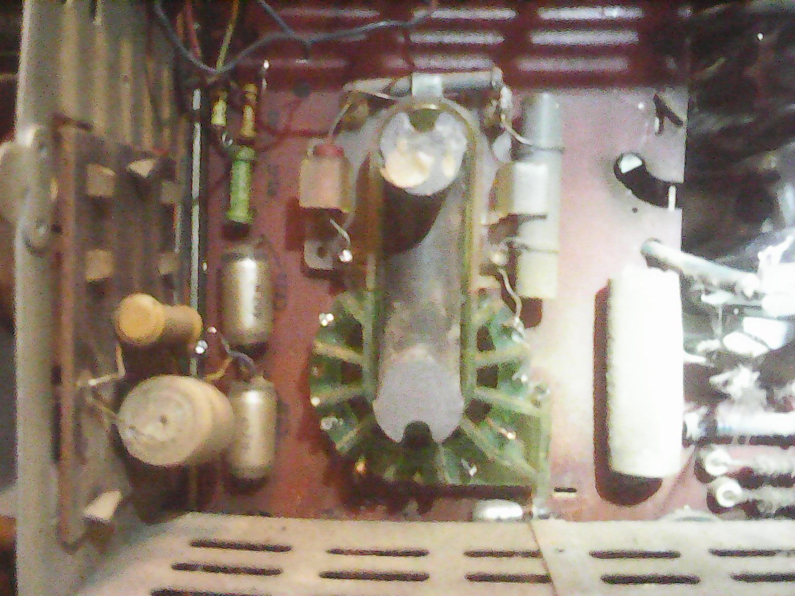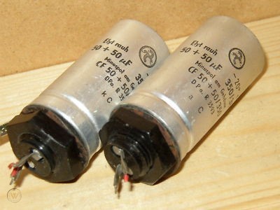 Első körben a 32 + 32 µF elektrolit kondenzátor helyére keresnék egy megbízható példányt. Akár ilyen 50 + 50 µF - os is jó lehet bele. A kora alapján biztos, hogy csavarmenetes, és az is, hogy bakelit szigetelő alátétnek kellett lennie alatta, mert a negatív pólus nincs rajta a fémházon.