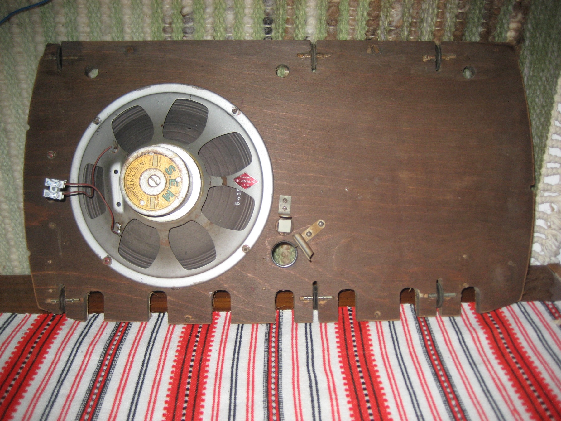 Jó lenne szépen helyreállítani. 1. kép: így került hozzám. 2. kép: a lakk eltávolítása után. 3. kép: a falhoz állított hangszóró kitűnően szól. 4. kép: nem csoda, mert ez a híres francia hangszóró.