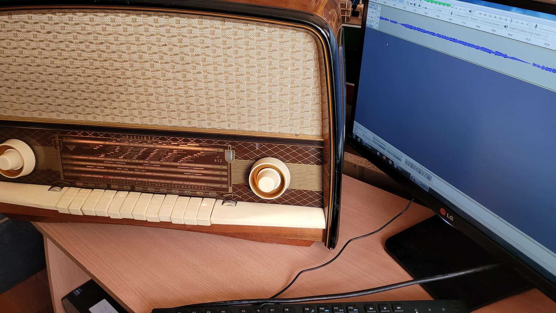 Egyrészt kicseréltem a gépet egy normálisra, (Realtek ALC887 integrált audio chipset), valamint a rádióra most egy másik szintén általam épített másik konvertert kötöttem, ami szerintem jobb jelerősséget ad. (LA1185-ös IC-vel készült, pontosan annak egy helyettesítőjével: az AN7205-ös IC-vel, mert ez volt kapható ).Eszméletlen jó hangminőséget ad így a magnókimenetén a rádió. Valahogy, mintha több lenne benne a mély mint a tranzisztoros rádiókban. (Ezt lehet csak bebeszélem magamnak mondjuk, még sosem volt ez előtt csöves készülékem).