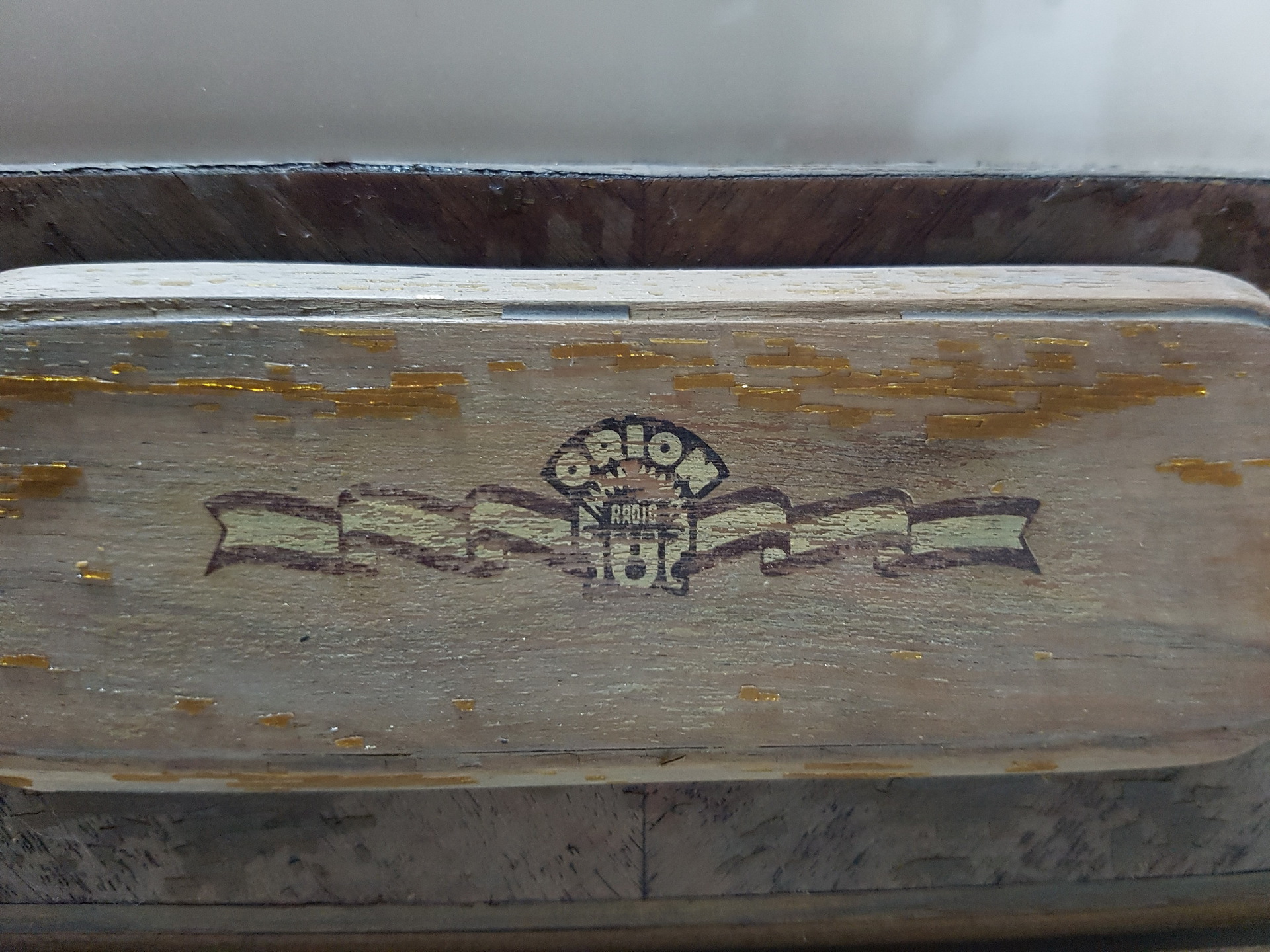 Sajnos nem intarzia, ugyanúgy matrica. Csak egy viszonylag jó állapotút fényképeztem le, hogy látsszon. Másiknál ugyanúgy lemállott lakkostul. Az utolsó képnél eleve nagyon pergett a lakk (igazából lehet politúr volt, de ebben nem vagyok biztos), de hogy ne szemeteljen, seprűvel letöröltem róla a többit. Amit a matricán hiányt látsz már, az mind akkor jött le.