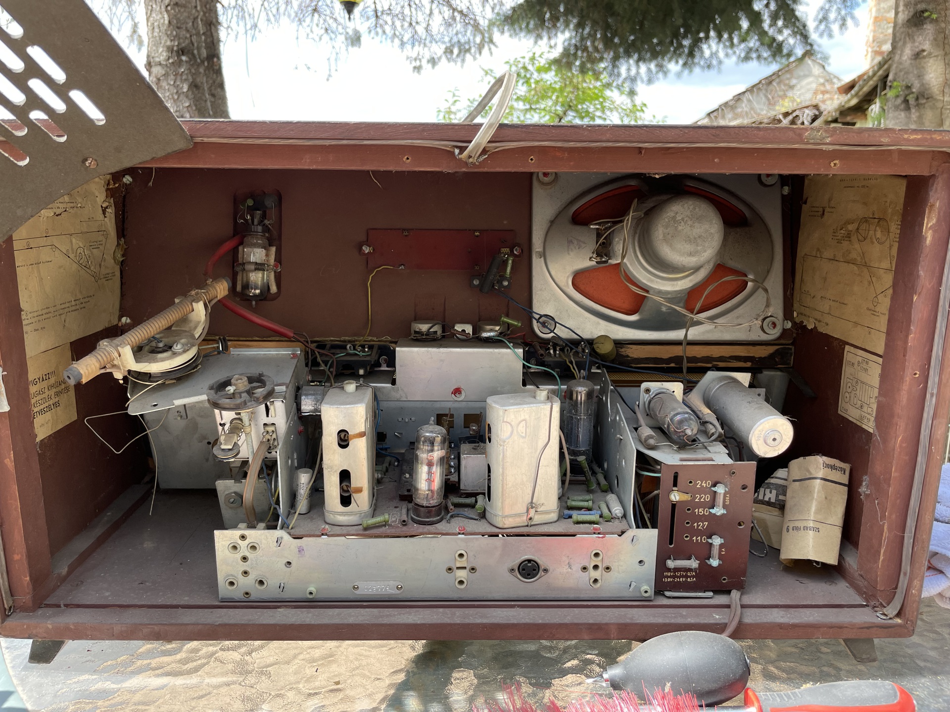 Van egy Terta Typ T422 rádióm, ezt szeretném életre kelteni. Fellelt darab, így első ránézésre több sebből vérzik. A zsinórjai el vannak szakadva, illetve a rövidhullám kapcsolója mintha ki lenne törve. Bedugni még nem mertem, biztosítékok elvileg jók, ránézésre a csöveket nem tudom. Hol kezdjem a javítást? Itt találtok nagyobb képeket.