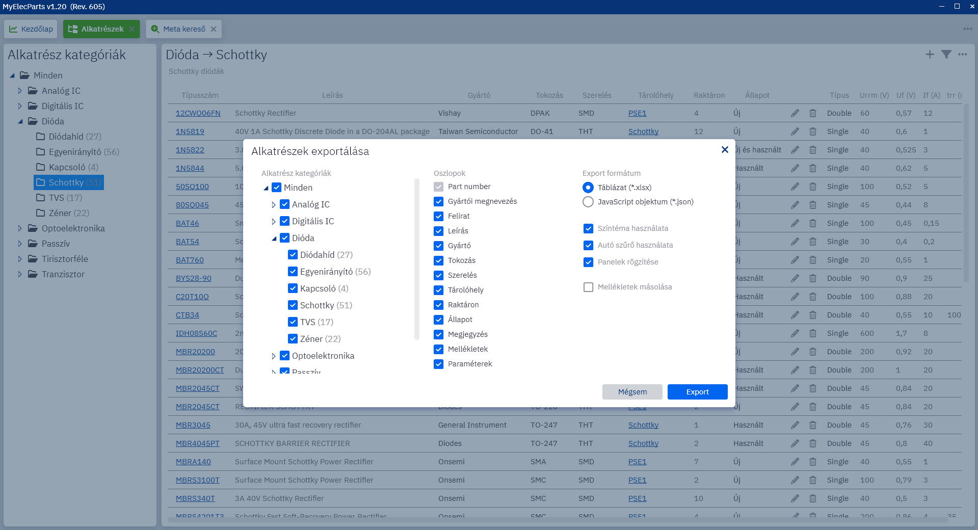 MyElecParts v1.20A MyElecParts v1.20 elkészült. A fő fókusz az alkatrészek exportálása xlsx vagy json formátumba és a meta kereső bővítése passzív alkatrészekkel.• Alkatrészek exportálása XLSX és JSON formátumba • Meta kereső: Mikrokontrollerek, passzív alkatrészek támogatása • Meta kereső: Datasheet4U keresés javítása • Automatikusan elrejtett tálca hiba javítása • 3 új alkatrész kategória hozzáadva (mikrokontrollerek) • alkatrész kategória paraméterek bővítése • 3 új tokozás hozzáadva (Quartz) • 9 új gyártó hozzáadva • Hibajavítások