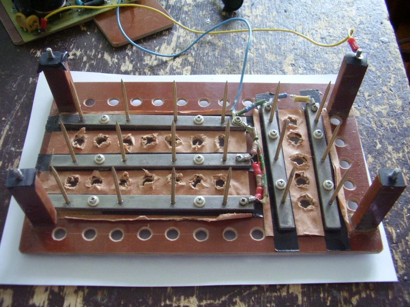 A csúcsok -negatívra vannak kapcsolva,3as réz hegg.pálcából készültek. Meg csinálhatod 4es-böl is,igaz így több munka lesz vele.A lemez +ra megy,lukak 8mm.méretűek.Csúcsok +lemez közti táv kb.7-7,65mm.Ezt úgy állíts be,hogy parányi méretű kerek kék pont látszódjon, sötétben,kb.1mm.oldalról pici ív/halk sistergés.A nf.ne legyen több 7,2-7,6KV-nál,a káros ózon termelés elkerülése miatt.Ez ugyanis 4-5óra után fejfájást,szem-kötőhártya ingerlését okozhatja.A laposvasakat rendesen ki kell szigetelni,a bakelit/lemez közt is legyen 3réteg 0,10-es préselt papír,pl.prespán.Felfogató 4es furatok szig.gyűrűkkel vannak ellátva,ide jönnek 3as csavarok.A képeken látszik ez.
