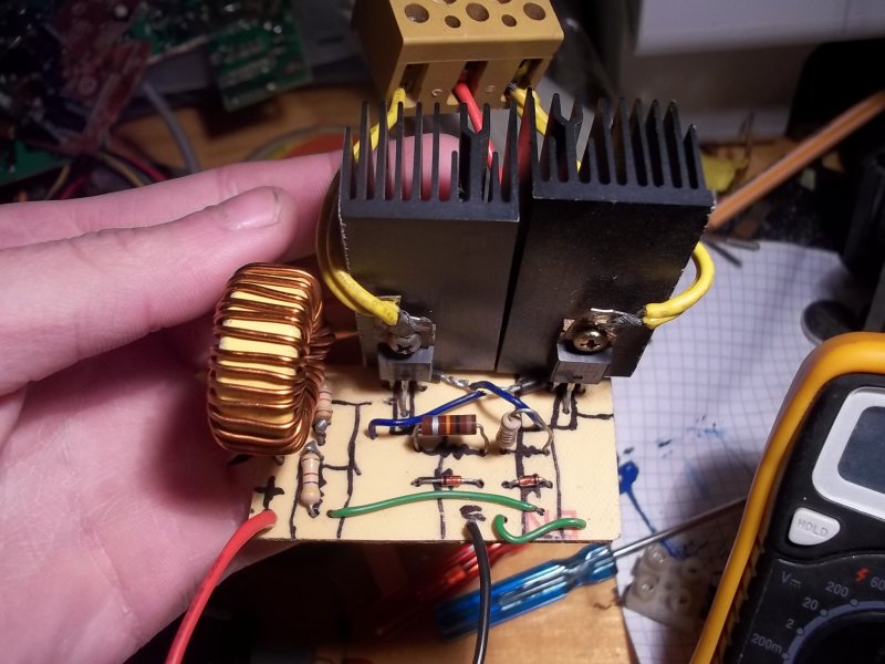 Igen, egy kicsit primitív, de az a lényeg hogy működik. Most IRF740-s fetek vannak rajta, amik nem is rossz hatásfokkal mennek, mert 180-190W-t simán kilehet hozni belőlük. A képek megtekintése csak erős idegzetűek nézzék meg! Ám bontott dolgokból is lehet csodát alkotni. >>>Újrahasznosítás.<<<