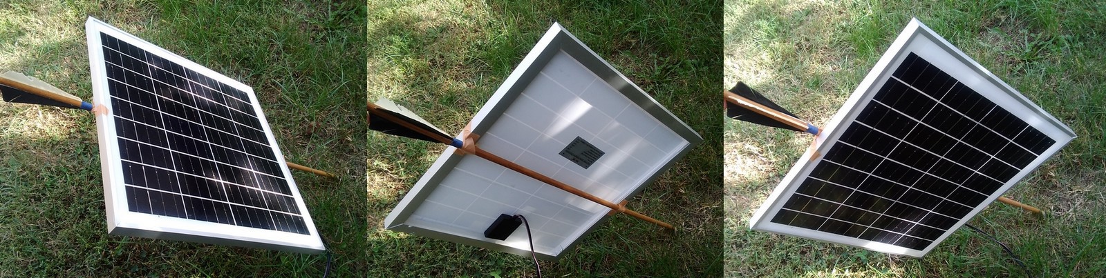 A plusz egy modullal meg semmivel nem leszel előrébb, csak magasabb lesz a csúcs, délelőtt/délután ugyanúgy mintha ott sem lenne. Nem a csúcsra kell törekedni, mert pont hogy az a pénzkidobás, ha úgy termelsz hogy közben az nem kell, nincs elhasználva. Ha van egy folyamatos (átlag) 400Wh-s energiaigénye a háznak (az 9,6kWh/nap), arra minek több kWp napelem? Amikor azt ki tudja szolgálni 3-4 tábla is akkutöltéssel együtt is, csak a táplálás idejét kell megnyújtani. Az árról meg annyit, hogy nekem ez a képen látható 4 panelhez való szett (3 sín+12db kampó) amit minimum meg kellett vennem hogy fel tudjam őket tenni a tetőre kb. 65 ezrembe került, de csak így hogy magam raktam fel, mert a felrakásért szintén elkértek volna közel ennyit. Nem hinném, hogy abból ne lehetne megvenni némi vasanyagot, 8db csapágyat (kb. 2500Ft-jával darabját) amit fel lehet húzni a horganyzott cső végeire, és a képek szerint lehet a földön döntögetni, plusz a mechanika. Mert nem forgatni kell, hanem a kép szerint dönteni. A nyílvessző jelenti a tengelyt amire feltéve a napelem követi a nap járását reggeltől estig (első képen délre néz 45 fokban, második képen keletre dől a harmadik képen pedig nyugatra). És akkor reggel 7-kor már nem 5% teljesítmény van hanem 70%, meg ugyanúgy este is, ami nagyon nem mindegy. A tetőre nem azért szokás tenni mert ott a legjobb, hanem mert egyedül ott nincs útban, meg ott a legkisebb a kitakarás. Nálam is azért lesz a tetőn, mert egyelőre a földön nem tudom hova letenni és döntögetni, de már kinéztem neki a helyet. Az van jobb helyzetben akinek nem a tetője néz délre hanem a tető éle, mert az fel tud tenni két stringet, egyiket délkeletre a másikat délnyugatra és akkor egész nap van normális szintű bejövő energiája.