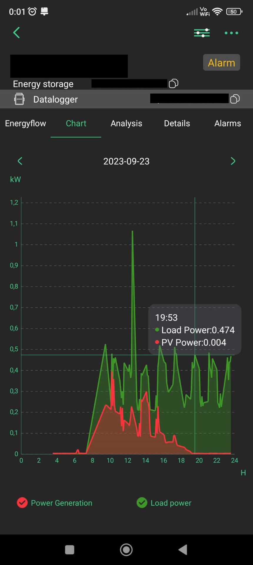 17:10 Esik az eső, de világos van. 3250 Wp mono napelem, 3 kW 1 fázis inverter. Termelés 23-27 W (napközben 2500 W felett is láttam.). Utcabeli (200m) 6280 Wp poli, 5 kW 3f inverter. Termelés 70-90 W. 17:30 Eső régen elállt, de világos van. Termelés 15-16 W Szomszédnál semmi. 18:20 Félhomály. Még nem alkony, de már nálam is semmi. 18:35 Alkony. 18:50 Este, de még nem töksötét. A fizika meg jól érzi magát.